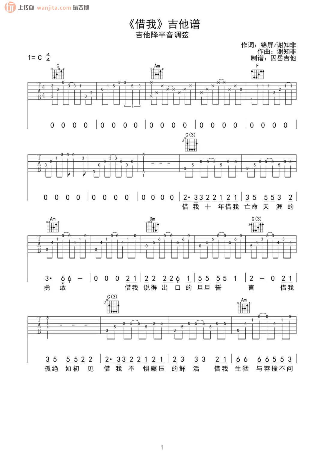 曲谱介绍: 借我吉他弹唱谱,原调C调,降半音调弦,不使用变调夹。曲谱比较简单,一些基础的和弦,让这首小清新的歌曲适合新手来练习,大家需要注意前奏的练习。总共5张高清图片谱例,由因岳吉他制谱分享。