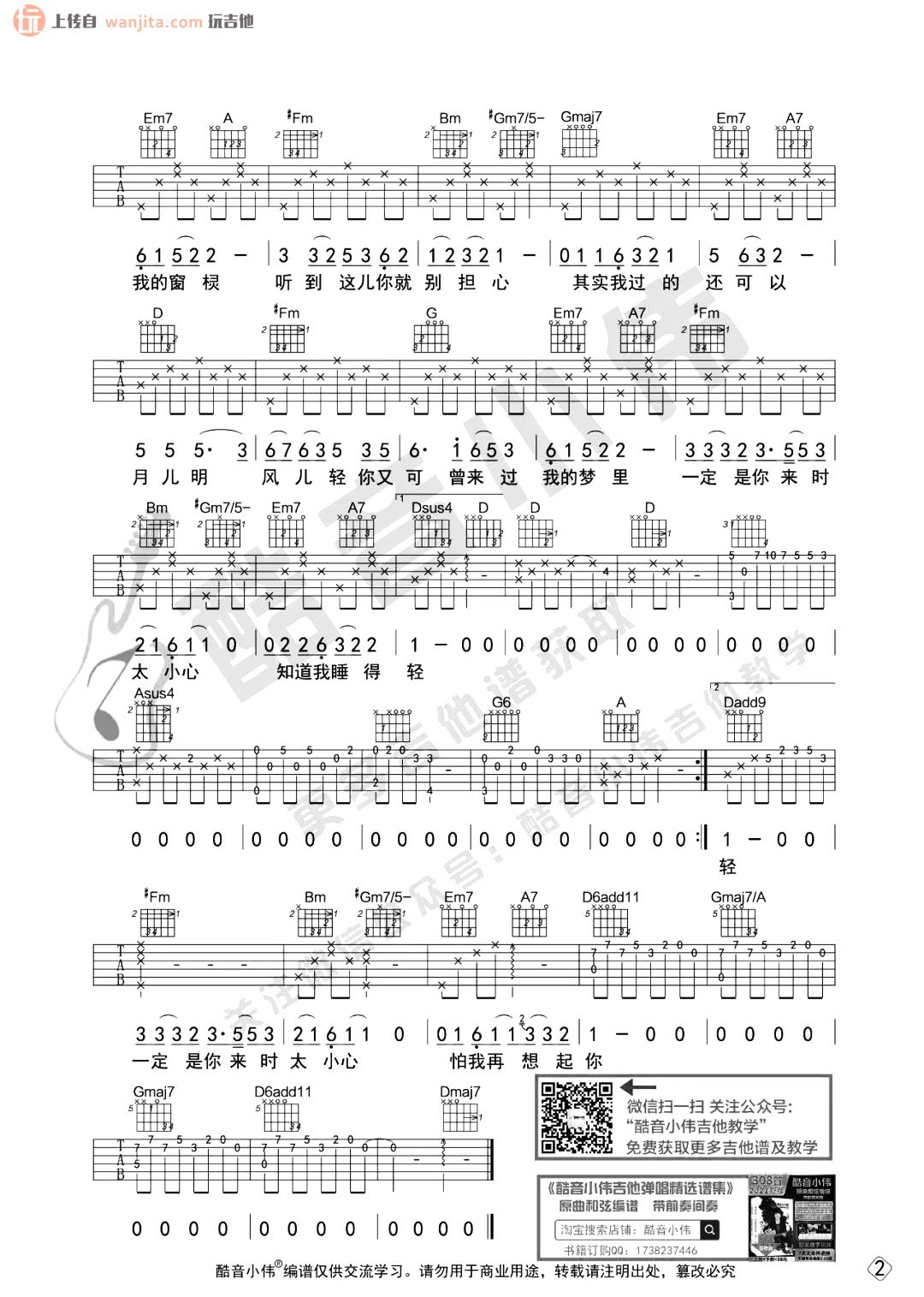 曲谱介绍: 这首吉他谱总共2张高清图片谱例,由小虎哥制谱分享。原调E调,选用D调,变调夹推荐加2到4品。比较简单的是歌曲的前奏部分,整体难度中等,这首清新的歌曲比较适合进阶练习弹唱。