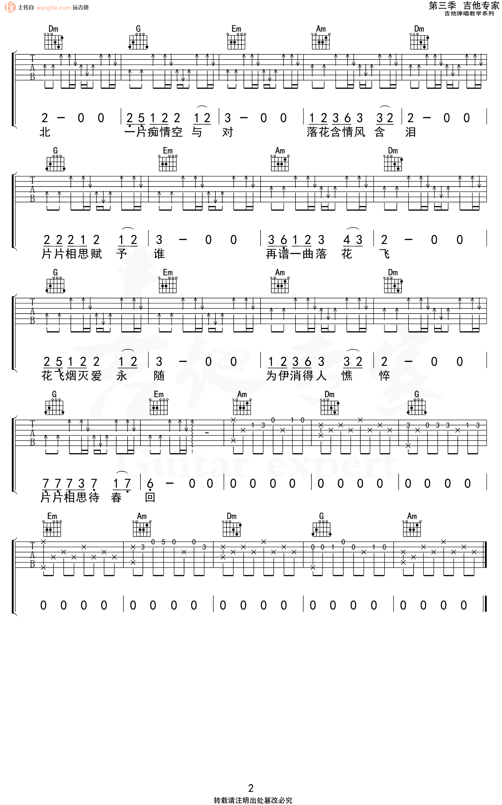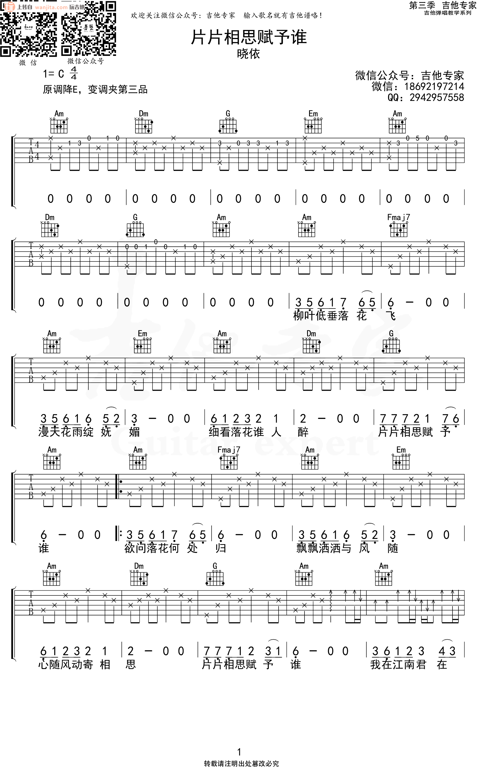 曲谱介绍: 《片片相思赋予谁》吉他谱,总共2张高清图片谱,由吉他专家编配制谱,选用C调,原调是E调,变调夹夹三品,分解和弦的方式弹唱,难度不大,喜欢的朋友不妨试试弹唱吧。