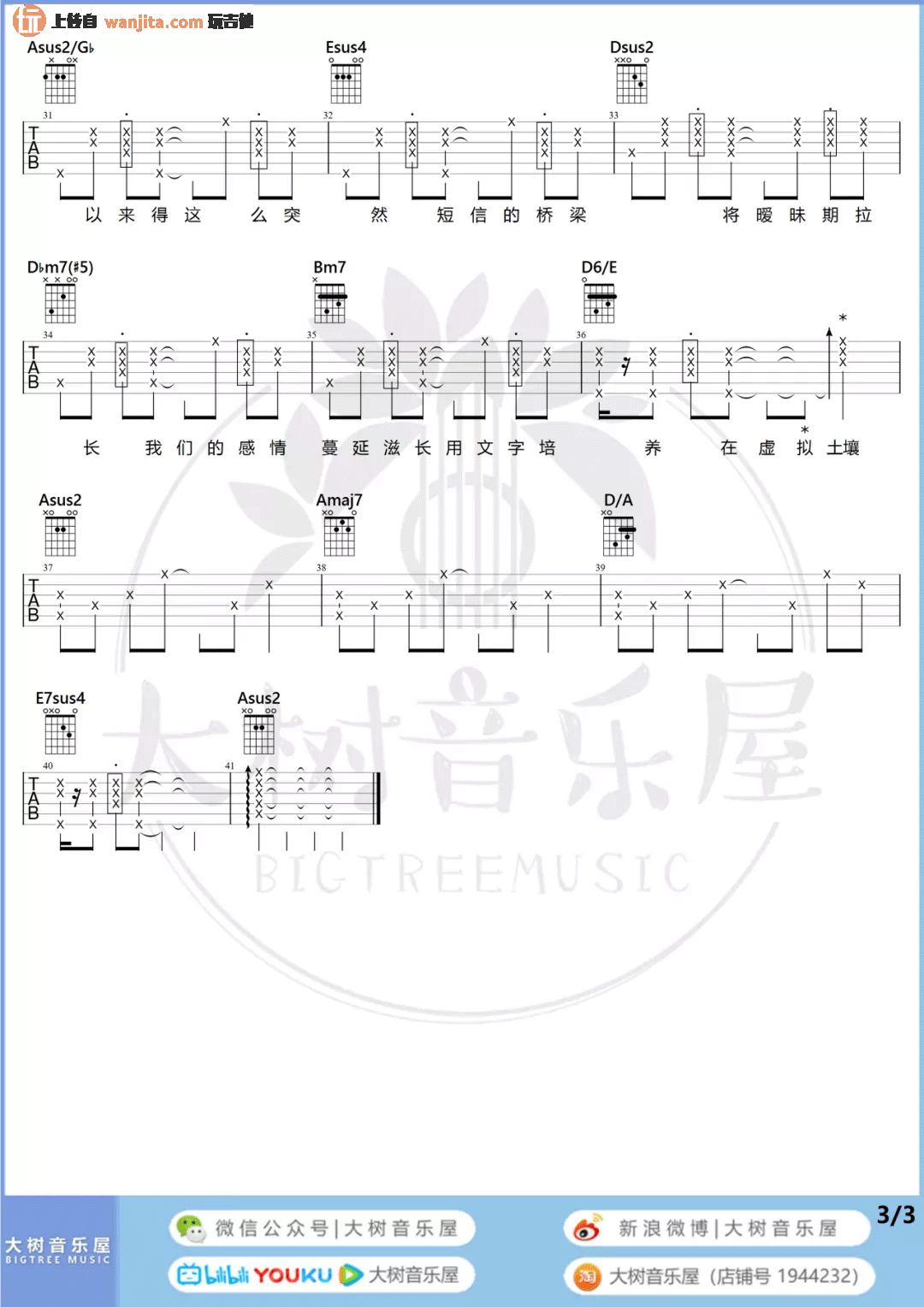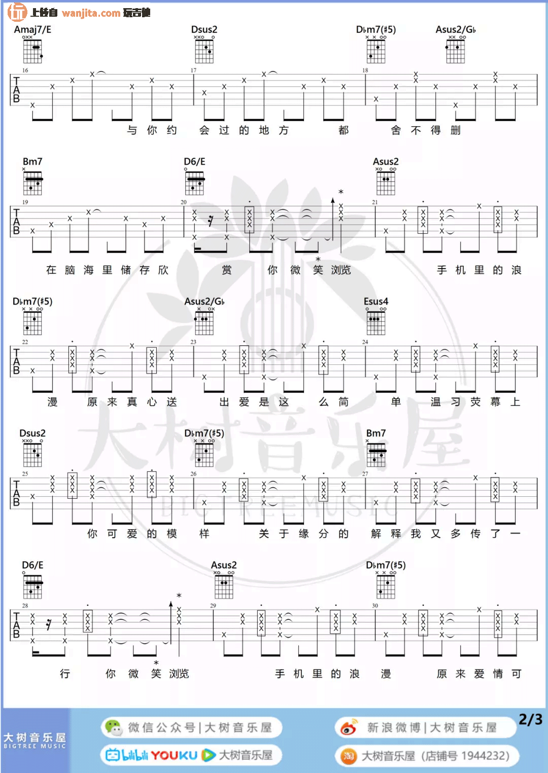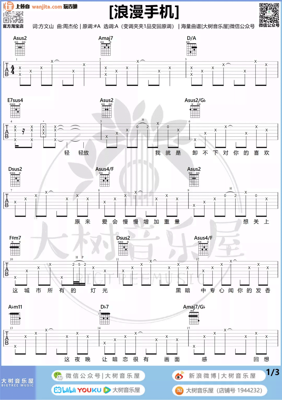 曲谱介绍: 《浪漫手机》吉他弹唱谱,由大树音乐屋制谱,总共3张高清图片谱,弹唱难度适中,其中还提供了歌曲的完整教学视频,大家练习的时候可以先参考教学视频。同时这首歌中主要的味道还是来自于拍弦的节奏型,也许面对这样的甜蜜小品,这样的节奏会让跳动的旋律更加有味道! 《浪漫手机》吉他弹唱教学视频
