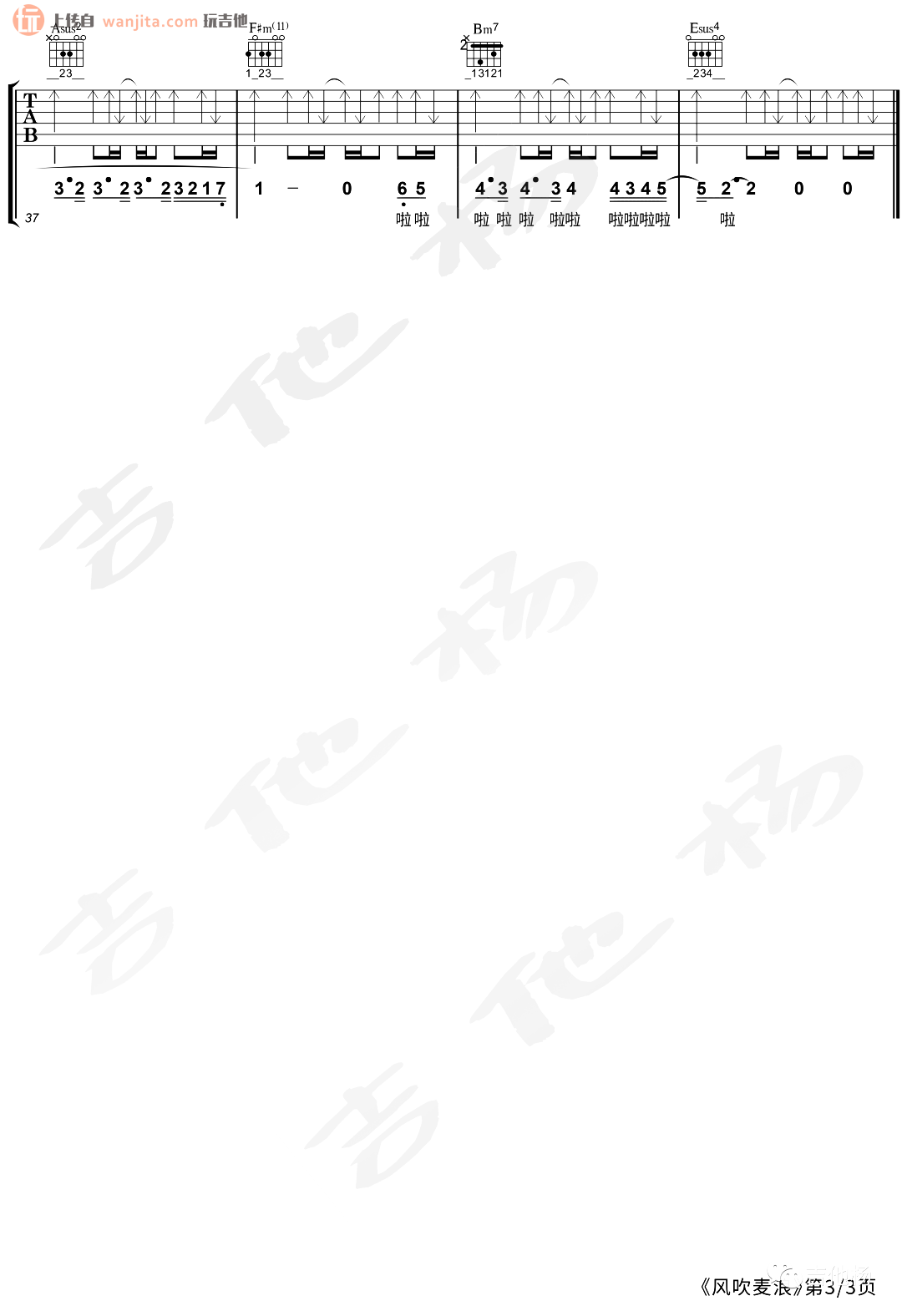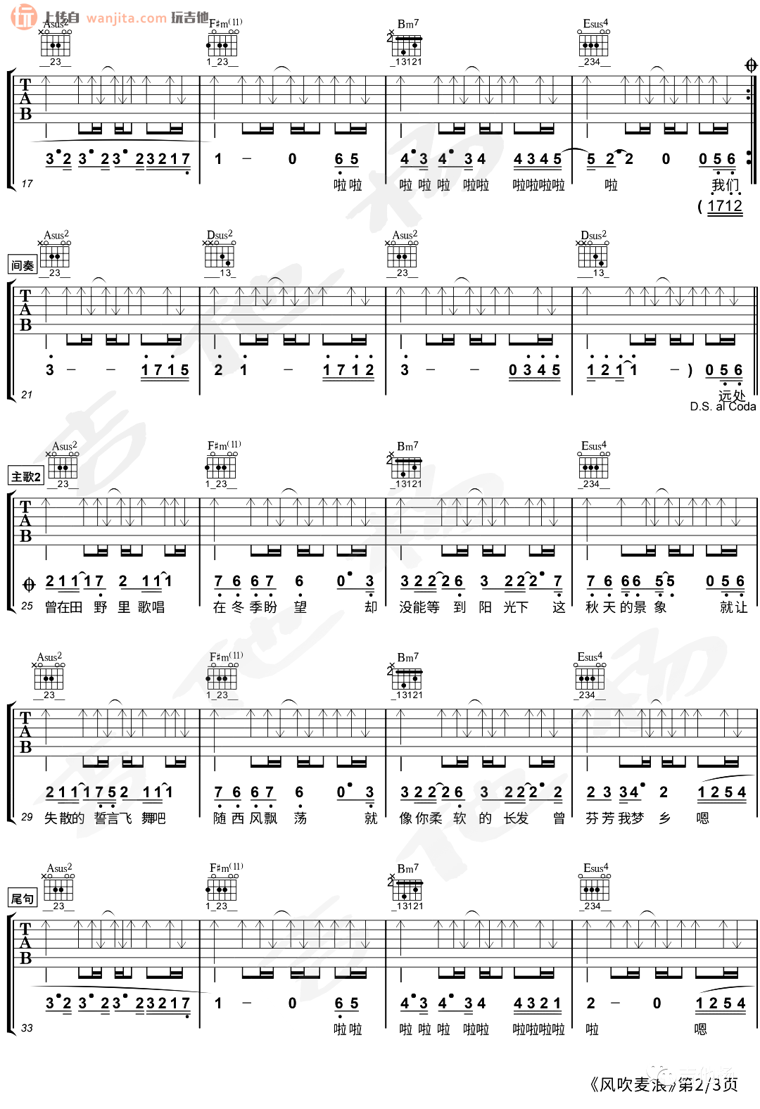 曲谱介绍: 这首吉他谱总共3张高清图片谱例,由吉他张制谱分享。,选用A调,不使用变调夹。这首舒缓的民谣歌曲和弦部分还是有一定的难度,不适合新手学习,这首歌曲的温柔塑造是顶级的,所以吉他的演绎更加显得有味道。 《风吹麦浪》吉他弹唱演示
