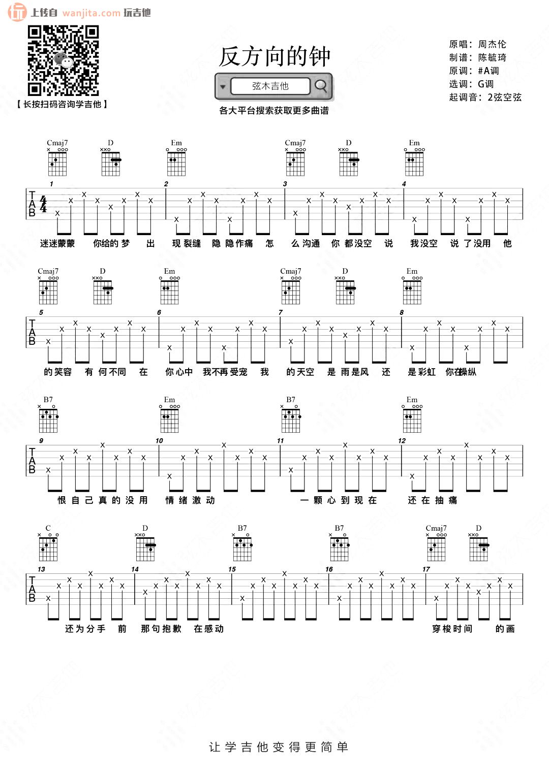 曲谱介绍: 《反方向的钟》吉他弹唱谱,原调#A,选用G调,变调夹夹2品。这首歌曲好听却不影响它的简单,三个和弦的使用,让这首歌曲十分容易学习,这首经典的周杰伦式的伤感情歌值得收藏。总共2张高清图片谱例,由弦木吉他制谱分享。