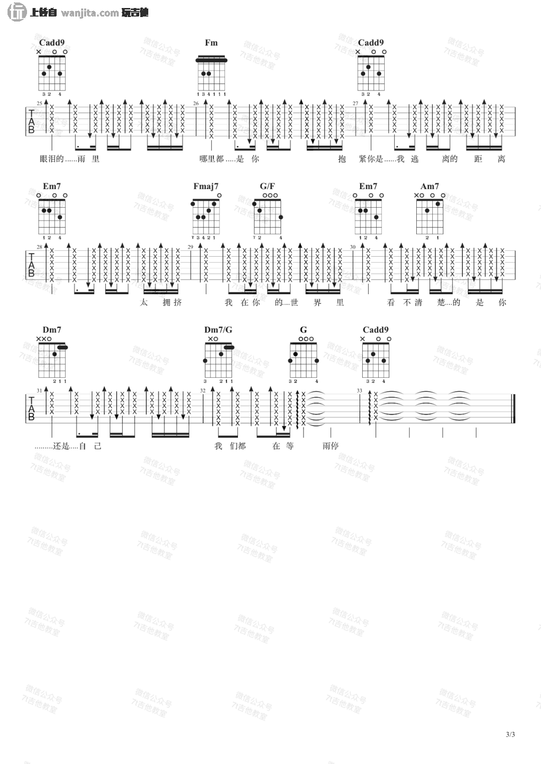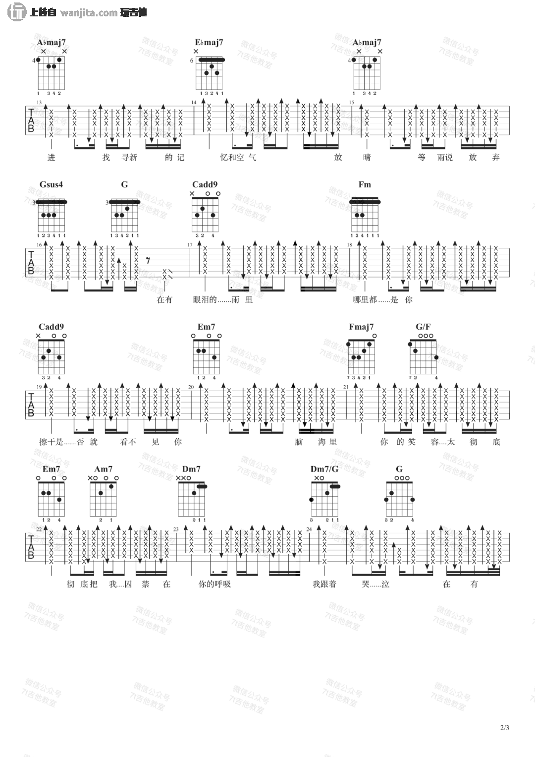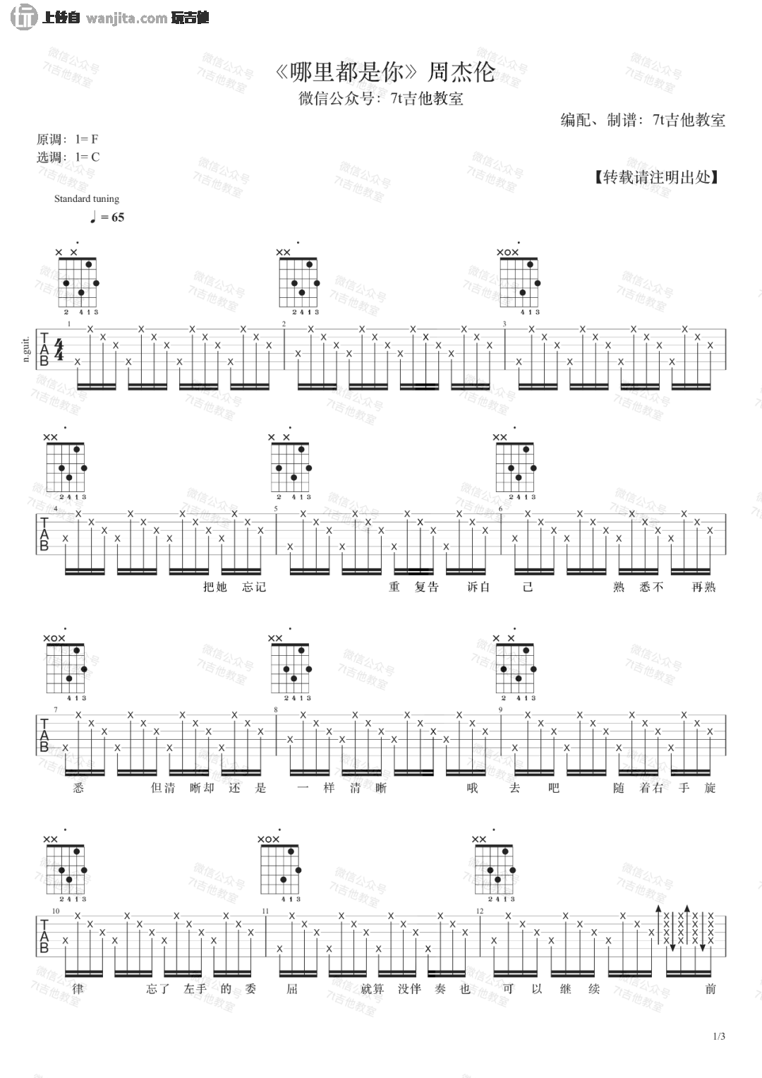 曲谱介绍: 哪里都是你吉他弹唱谱,总共3张高清图片谱例,由7t吉他教室制谱分享。原调F,选用C调,不使用变调夹。这首稳稳的幸福曲谱比较简单,适合新手练习,大家练习的时候要注意这首歌曲的节奏,同时可以参考下方这首歌的吉他弹唱演示视频。 《哪里都是你》吉他弹唱演示视频