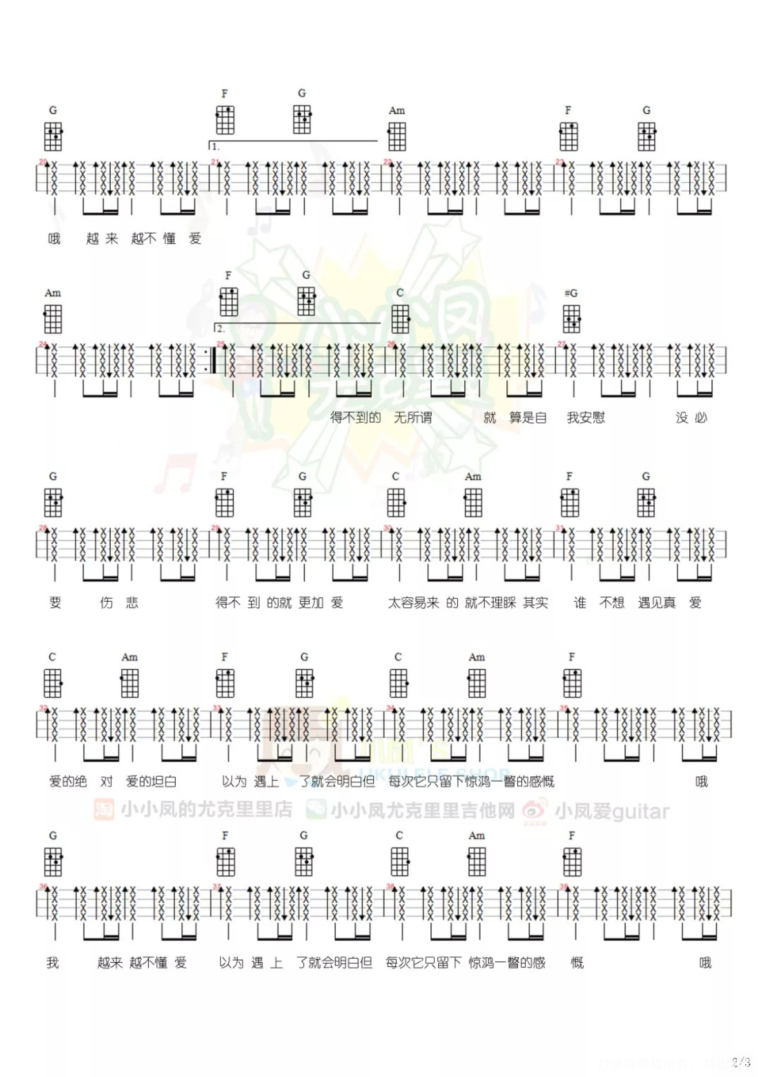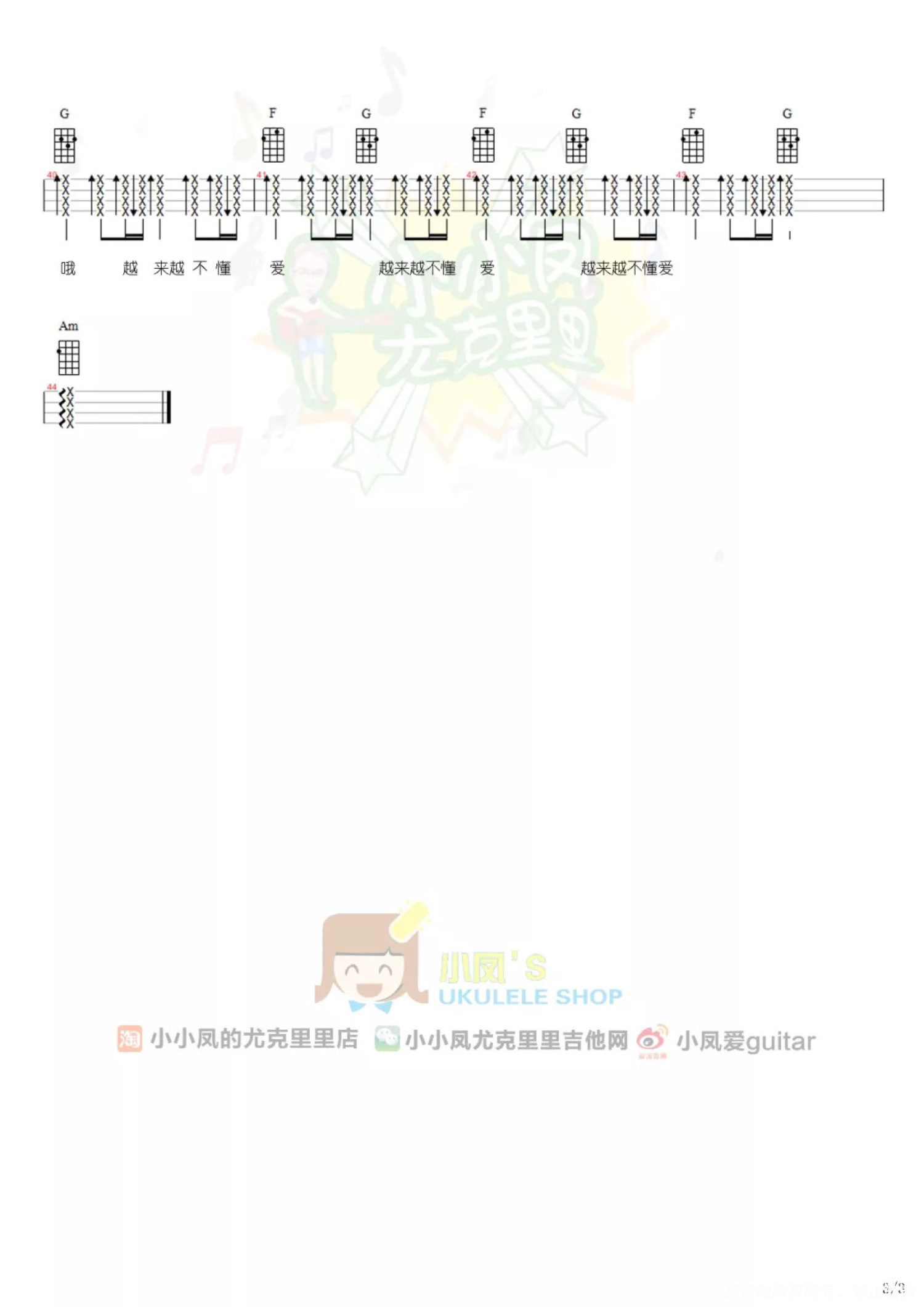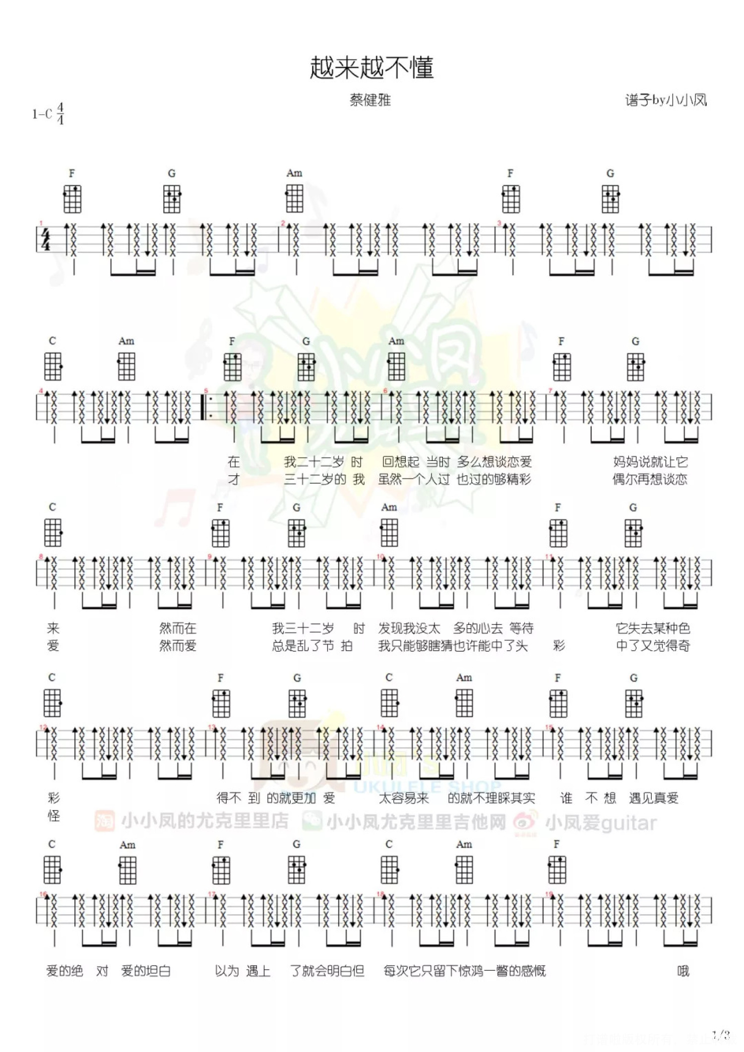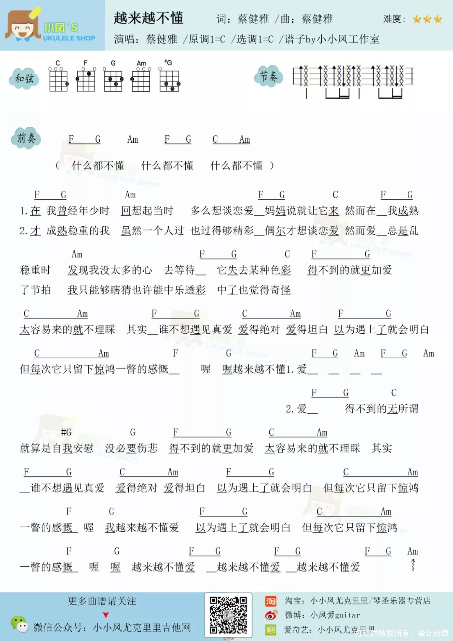 曲谱介绍: <越来越不懂> 现场版 教学视频 尤克里里谱 目录 每一个成名歌手都有着自己的 成名曲目和经典歌曲 在他们发展的鼎盛时期作品层出不穷 但其中不缺乏非常好听的 而当时却不怎么火的歌曲 Tanya蔡健雅十年前的一首歌 也是如此 这首<越来越不懂>发行于2008年 收录在<Goodbye&Hello>当中 当时Tanya 因为这个专辑 荣获了19届台湾金曲奖兼最佳制作人两项大奖 它改编自The Weepies演唱的 <Gotta Have You> 这首歌曾两度被带火 一次是16年王金金在<超女>舞台的演唱 另一次则是近期的网络翻唱 我很喜欢这首歌的副歌部分,特别是那句 “得不到的就更加爱,太容易来的就不理睬” 它似乎有着一种魔力 让人越听越上瘾   <越来越不懂> 现场版 听着这首歌时候 有种像似在诉说着我们的感觉 曾经我们也很渴望谈一场恋爱,但由于一直没有遇到喜欢的那个人,所以一直单着。 然后慢慢的,一个人生活久了 就习惯一个人了 一个人去逛街唱K吃火锅都很开心 只有在生病时候才会觉得一个人不好 外表看起来无毒不侵八风不败 其实心里骂过一万句mmp   时间过得仓促,我们自己也变得挑剔 以前觉得势在必得的感情,现在却不知道如何开始   即使有人喜欢有人追,却不知道该怎么谈恋爱 就像Tanya歌里唱得那样   当决定去谈一场恋爱时 却发现自己什么都不懂   教学视频   尤克里里谱 和弦谱:   详谱: