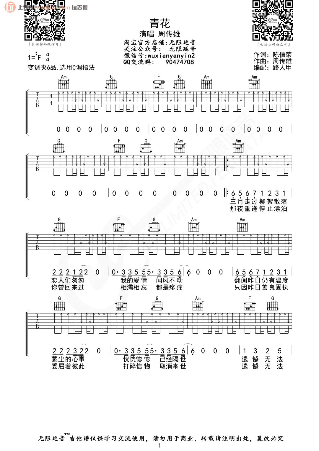 曲谱介绍: 《青花》吉他弹唱谱,总共3张高清图片谱例,由路人甲编配分享。原调#F,选用C调,变调夹夹6品可以弹唱原调。这首歌曲的调比较高,需要多加注意,歌曲里面情绪波动比较多,曲谱整体难度中等,需要大家掌握大横摁。