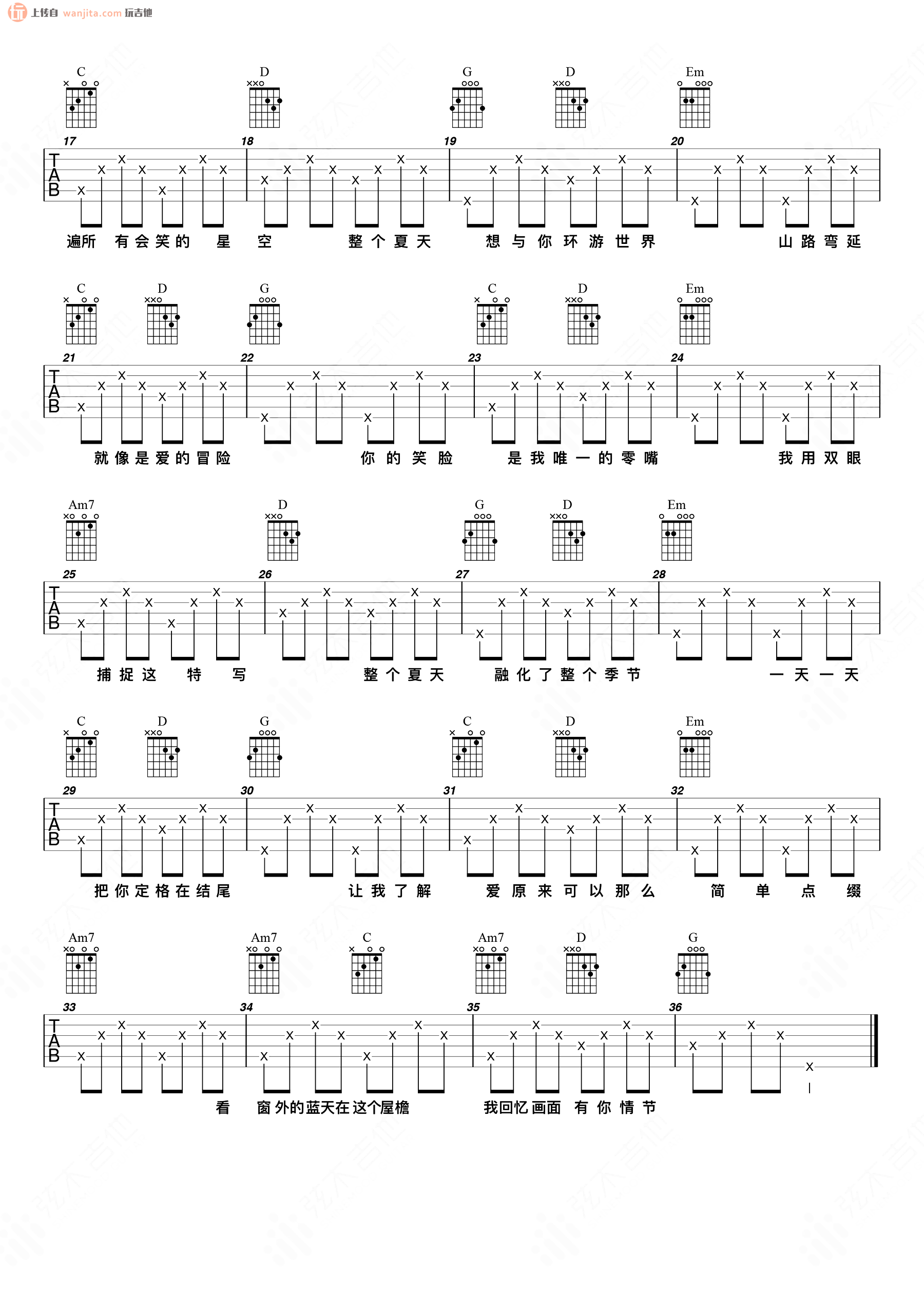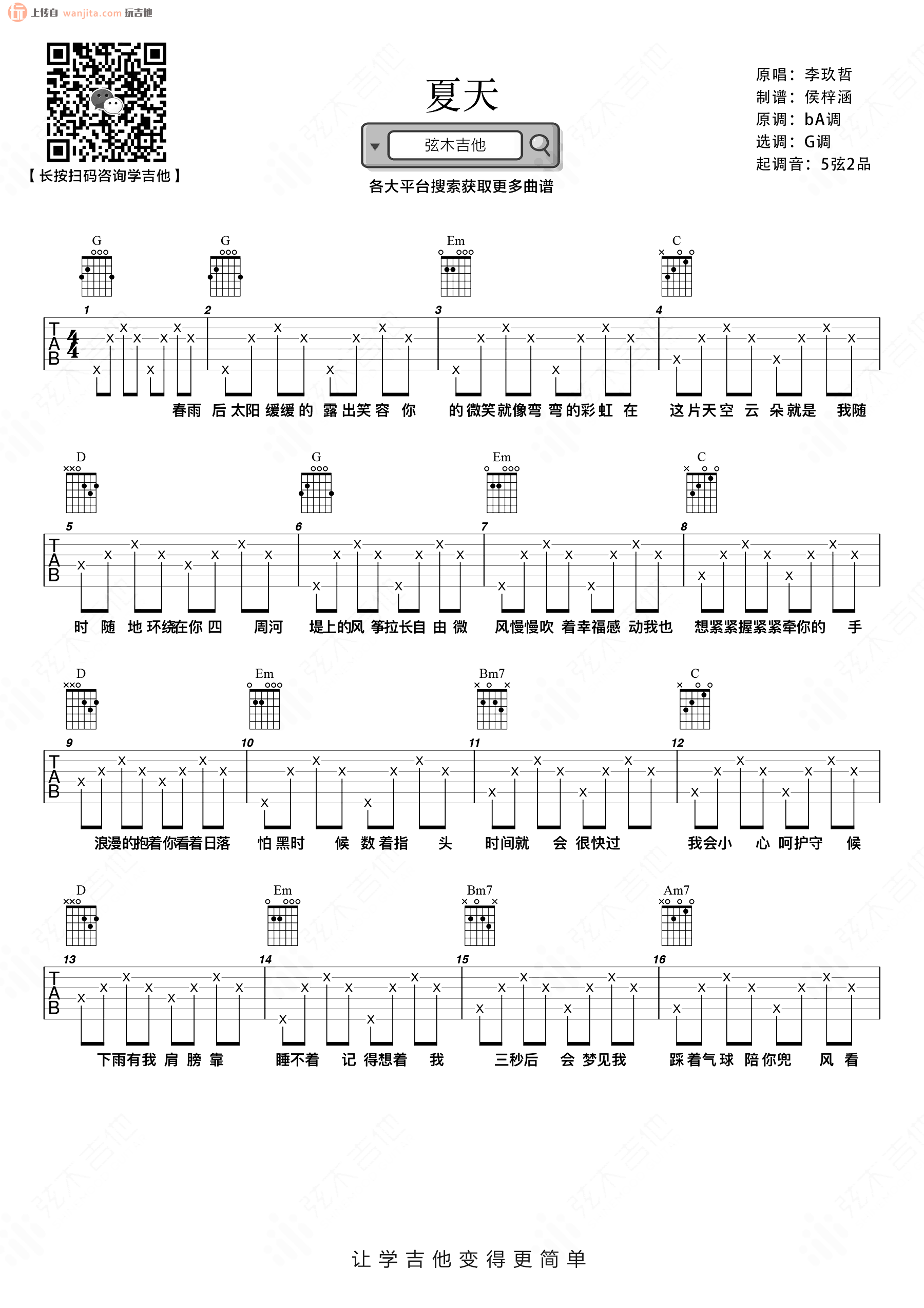 夏天吉他谱 - 李玖哲 - G调吉他弹唱谱