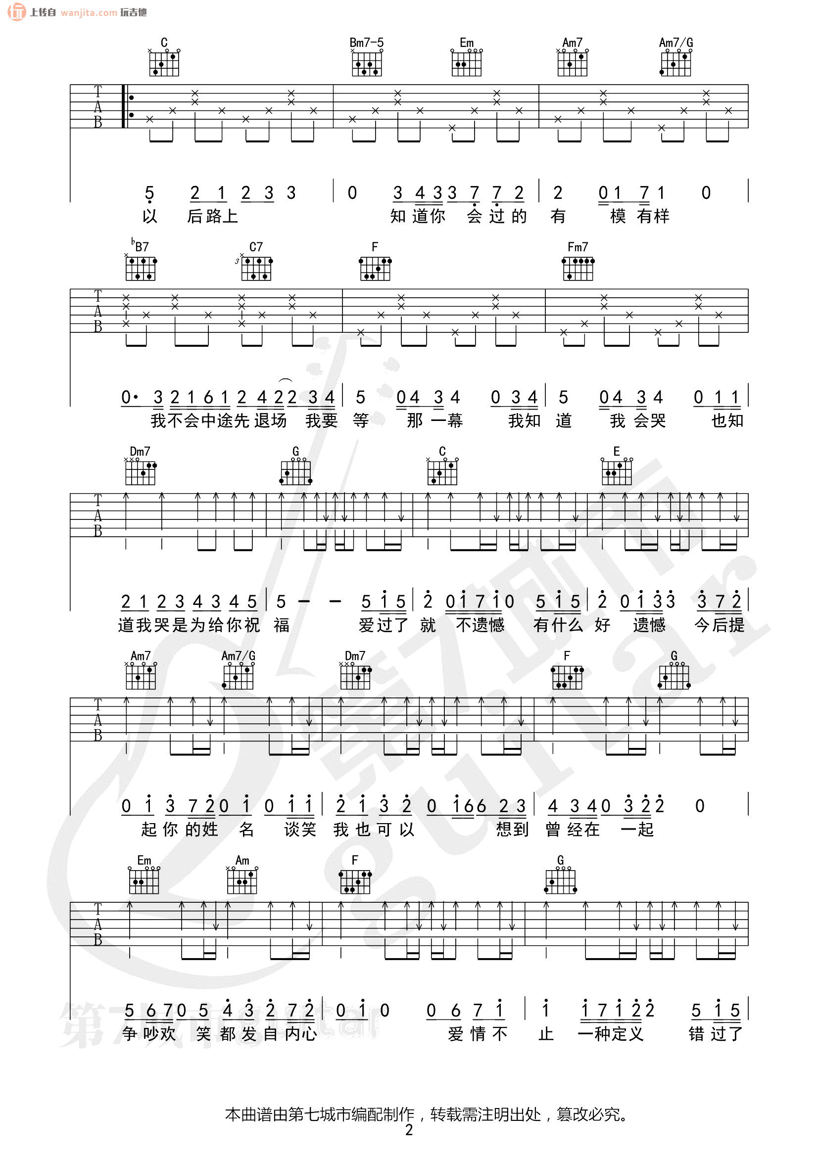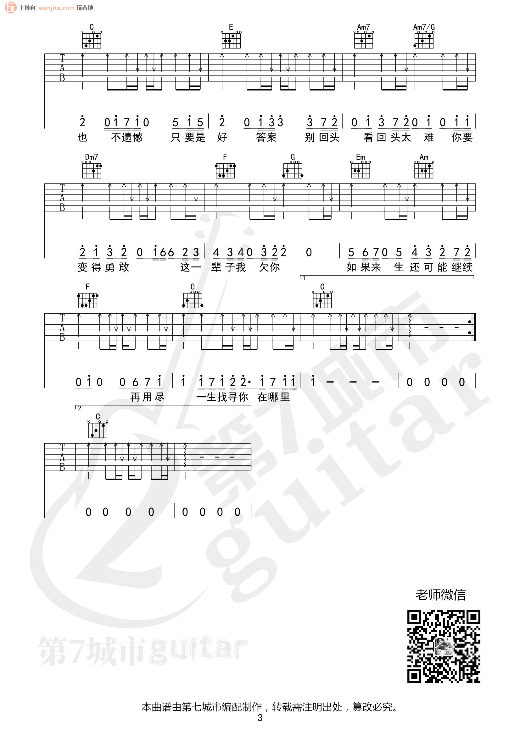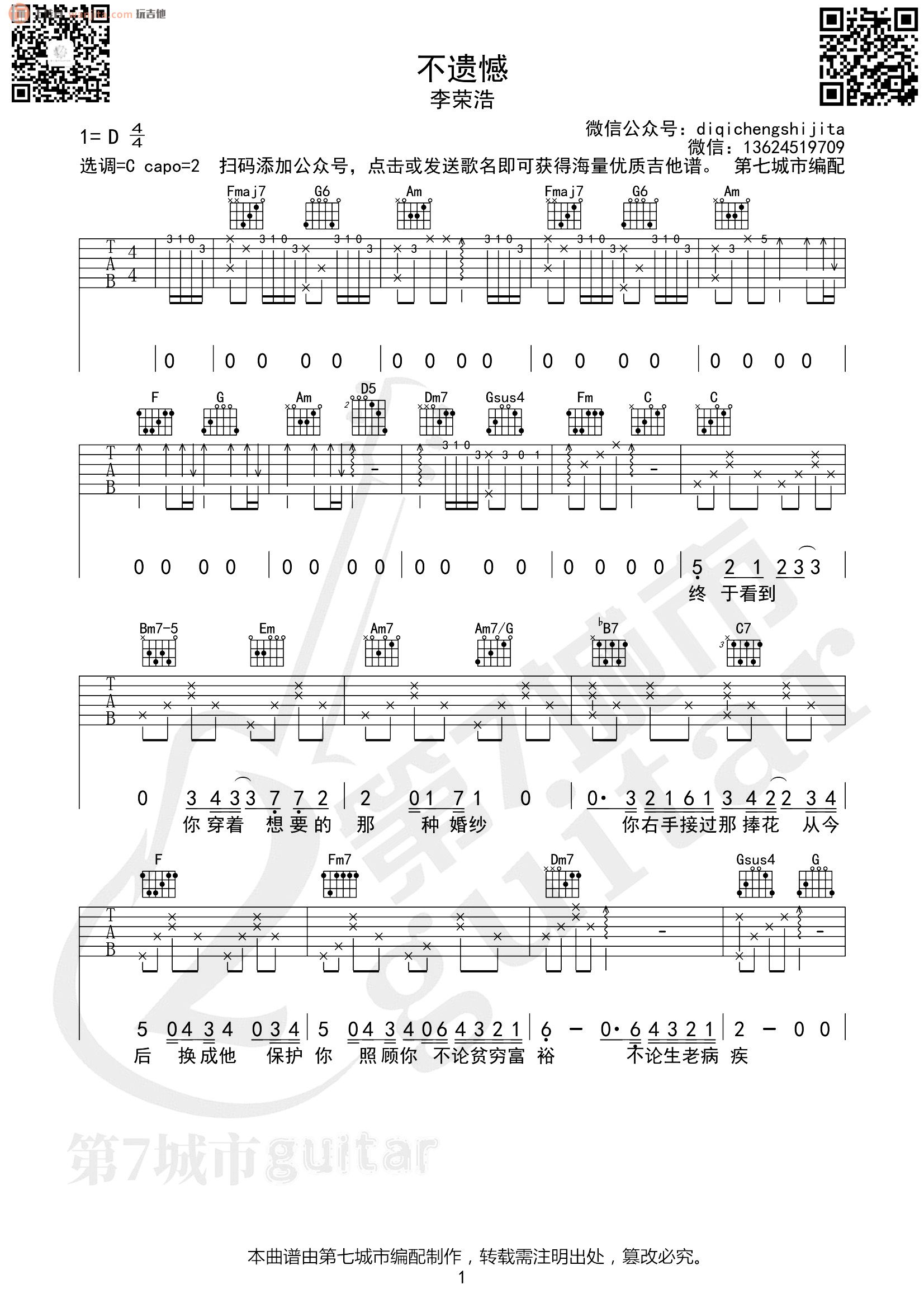 曲谱介绍: 《不遗憾》吉他弹唱谱,总共3张高清图片谱例,由第七城市编配分享。原调D调,选用C调,变调夹夹2品。这首歌曲的和弦虽然不是很难,但是这首歌曲的弹唱还是有一定的难度的,不推荐新手学习这首歌曲,歌曲的前奏部分好听又比较难学,练习的时候需要注意。