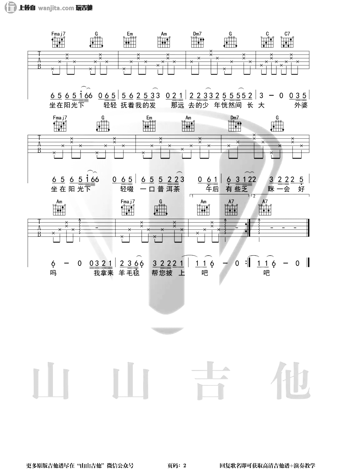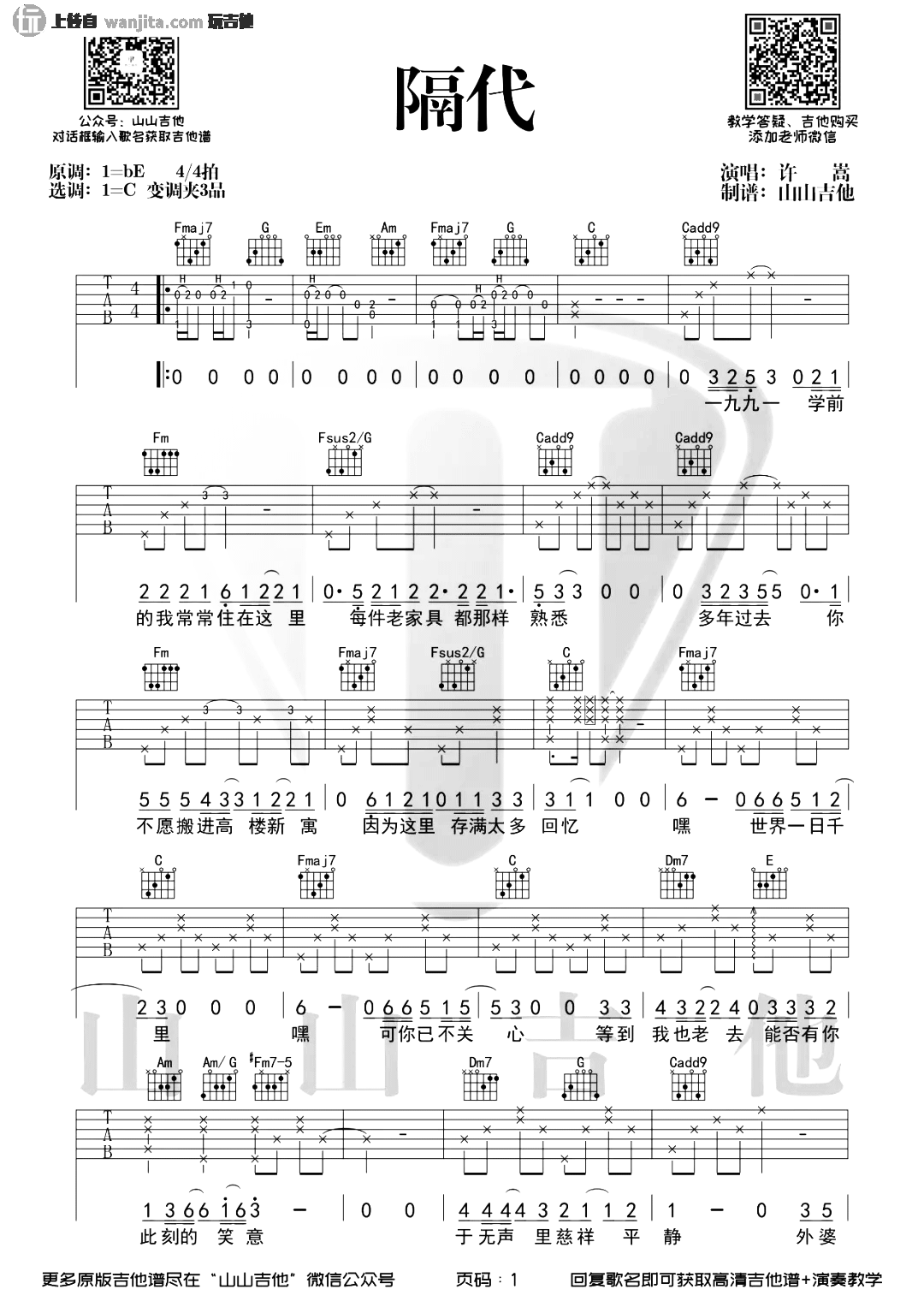 曲谱介绍: 《隔代》这首吉他弹唱谱,由山山吉他制谱,总共2张高清图片谱,选用C调指法,原调是bE,变调夹夹3品可以弹唱这首歌曲原版,建议感兴趣的同学参考下方弹唱视频演示,帮助自己练习好这首歌曲。 《隔代》吉他弹唱演示视频