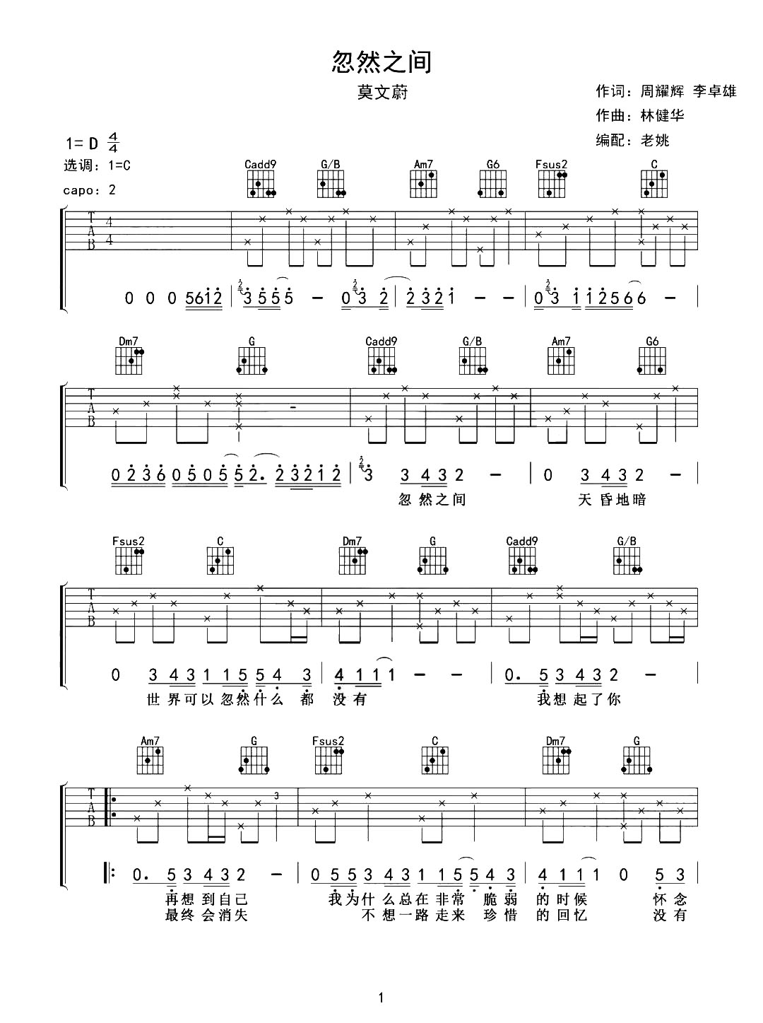 琴谱网为您精心推荐 忽然之间 高清图谱
