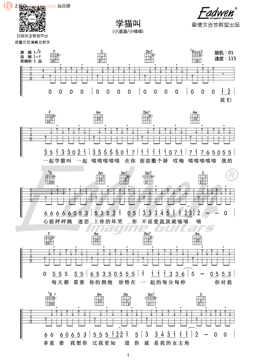 曲谱介绍: 学猫叫吉他弹唱谱,原调#F,选用F调,变调夹夹1品。虽然十分好听也好学唱,但是弹奏起来还是有一定的难度的,需要掌握大横摁,而且节奏感十分强烈,推荐练习的时候开着节拍器。 《学猫叫》吉他弹唱教学视频