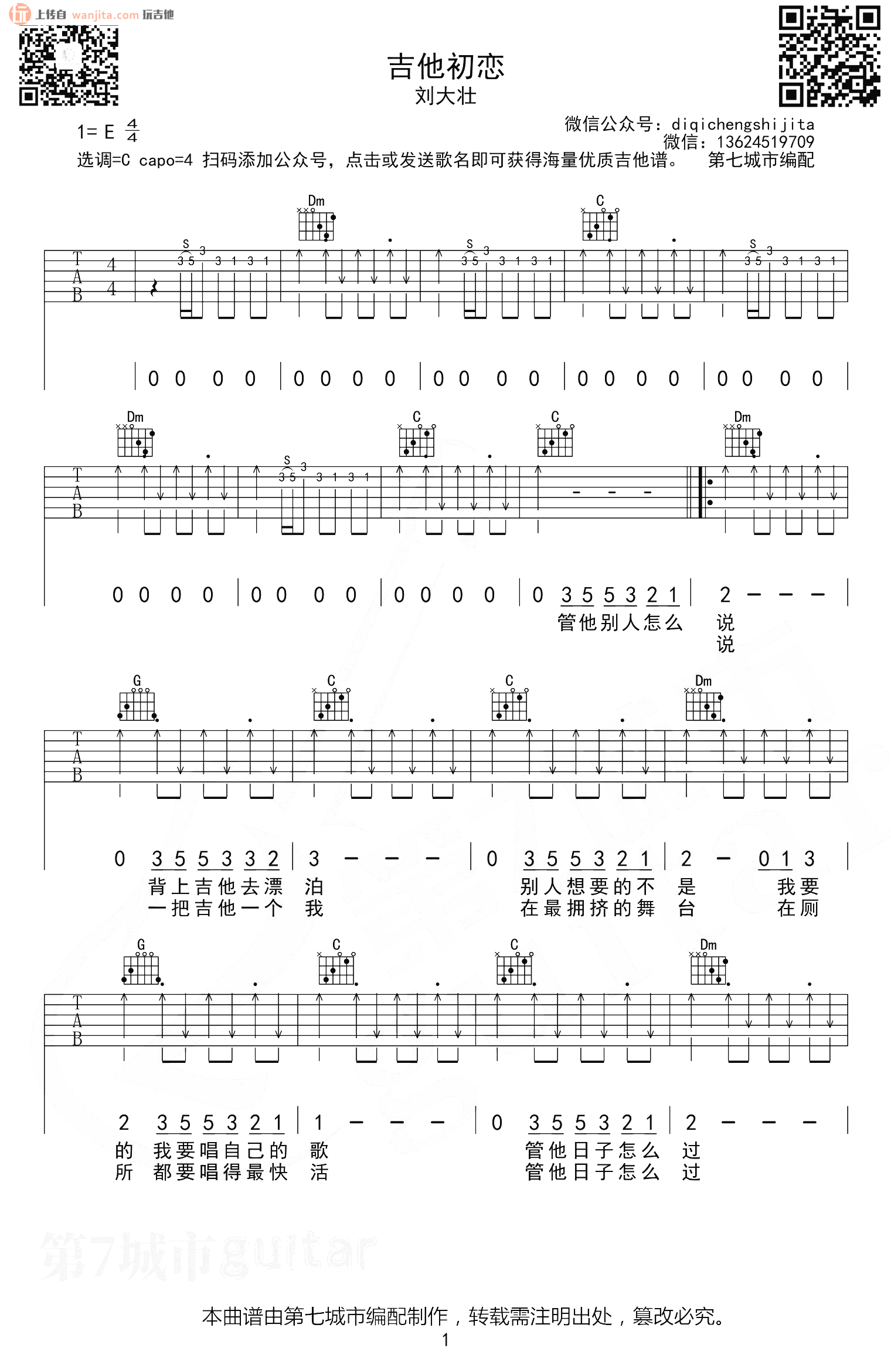 曲谱介绍: 这首曲谱总共3张高清图片谱例,由第七城市编配制谱。原调E调,选用C调,变调夹夹4品。简单的和弦和基础的节奏,让这首轻快的好听的歌曲容易被学习,推荐新手学习这首歌曲,虽然前奏用到一点技巧,但是也还算简单。