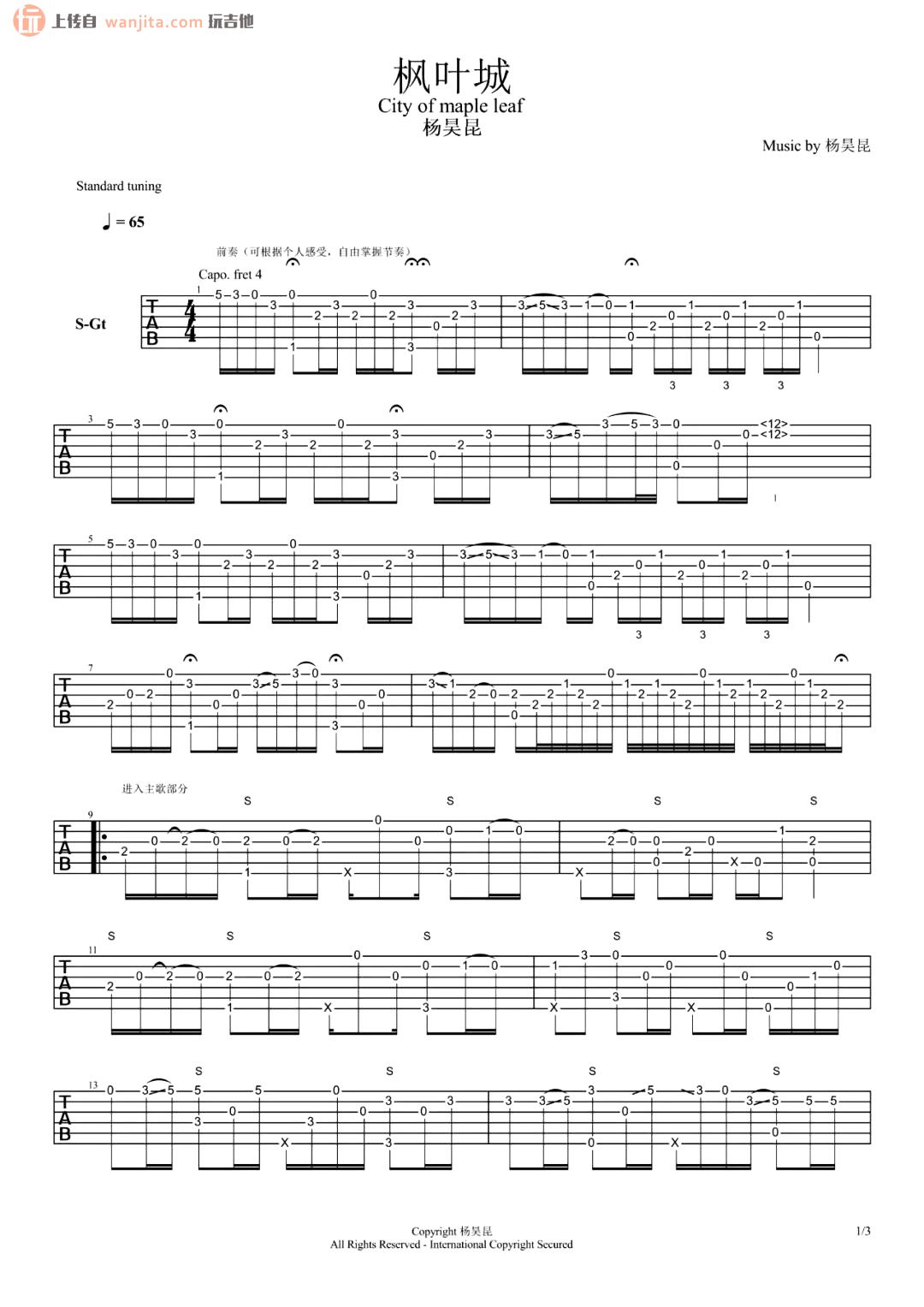枫叶城吉他谱 - 杨昊昆 - 吉他独奏谱