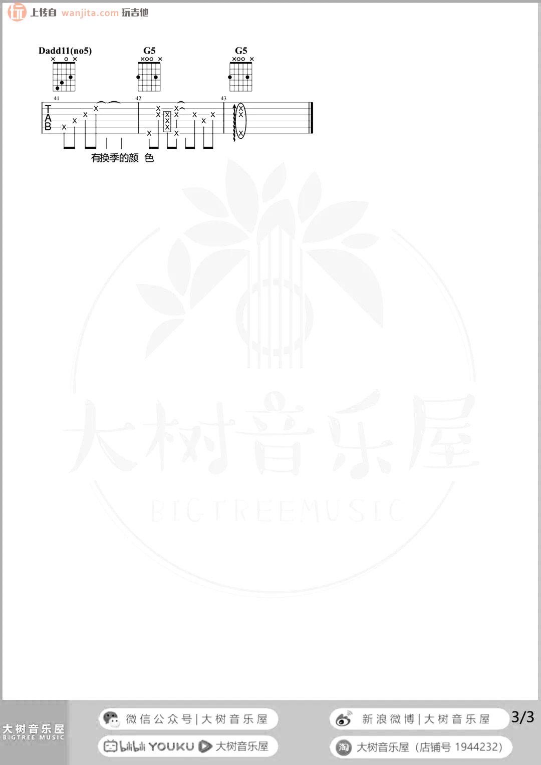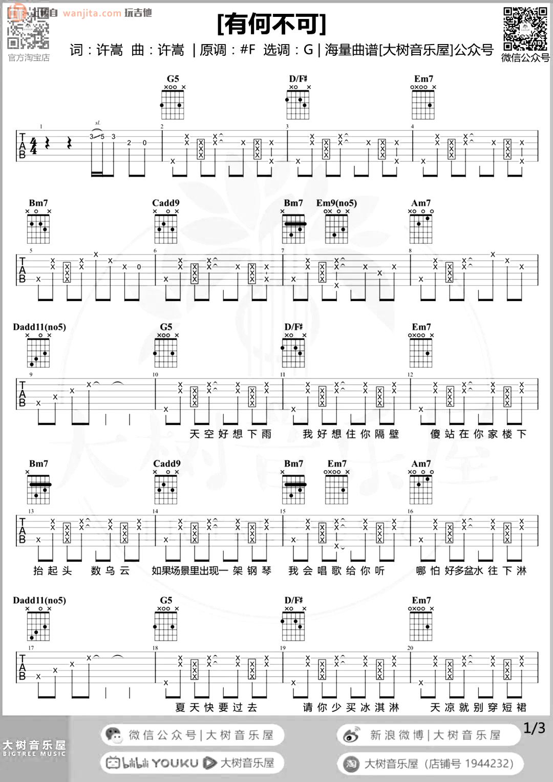 曲谱介绍: 有何不可吉他弹唱谱,总共3张高清图片谱例,由大树音乐屋制谱分享。原调#F,选用G调,不使用变调夹,这首歌的女生版演示视频为标准调音,变调夹夹在2品。虽然是一首比较简单的小情歌,但是弹唱起来还是有一定的难度,不推荐新手学习,大家练习的时候需要注意歌曲和弦的变换。总共3张高清图片谱例,由大树音乐屋制谱分享。 《有何不可》吉他弹唱演示视频
