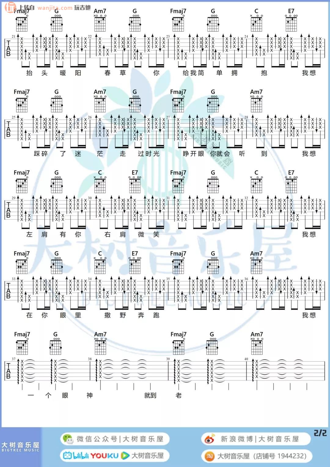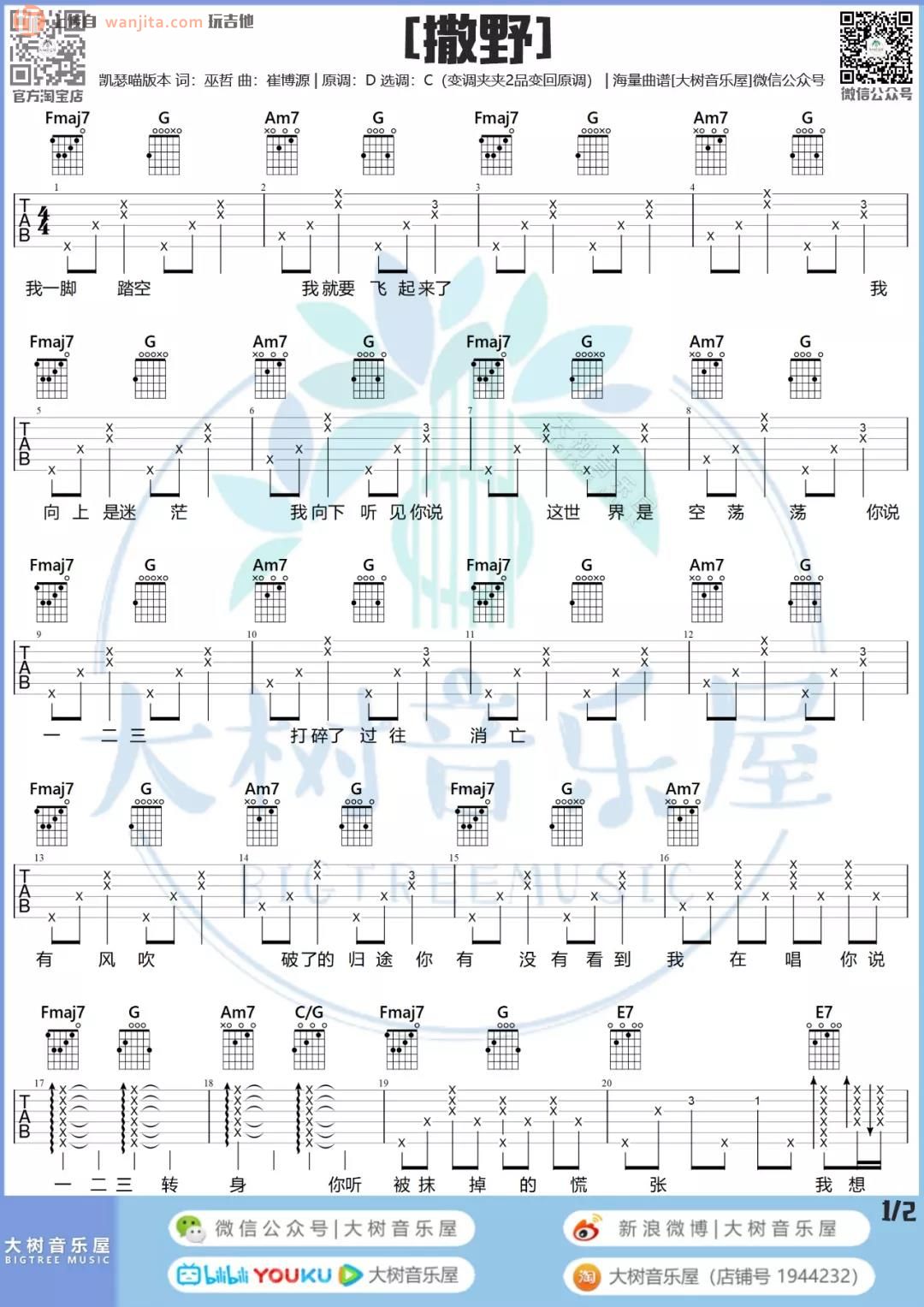 曲谱介绍: 撒野吉他弹唱谱,总共2张高清图片谱例,由大树音乐屋制谱分享。原调D调,选用C调,变调夹夹2品变回原调。歌曲节奏部分比较容易,和弦的变化还是需要多加注意,新手也可以学习,好听的一首歌曲适合大家弹唱。 《撒野》吉他弹唱演示视频