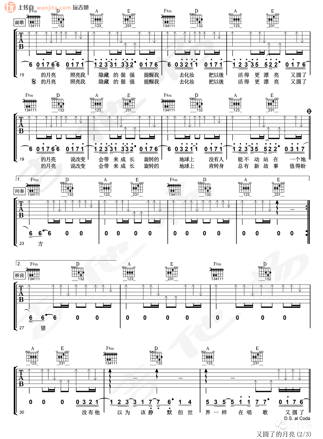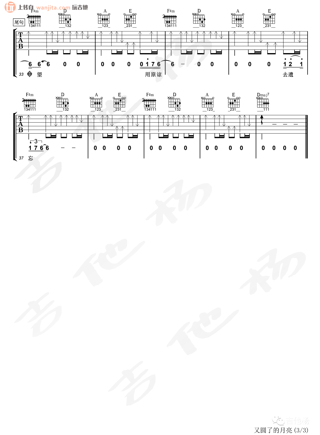 曲谱介绍: 这首曲谱,总共3张高清图片谱例,由吉他杨制谱分享,选用A调,不使用变调夹。这张谱子用到9种和弦,不算难的节奏,但是和弦的练习对于新手来说并不友好,不推荐新手学习。需要注意歌曲中间情感的转换。 《又圆了的月亮》吉他弹唱演示视频