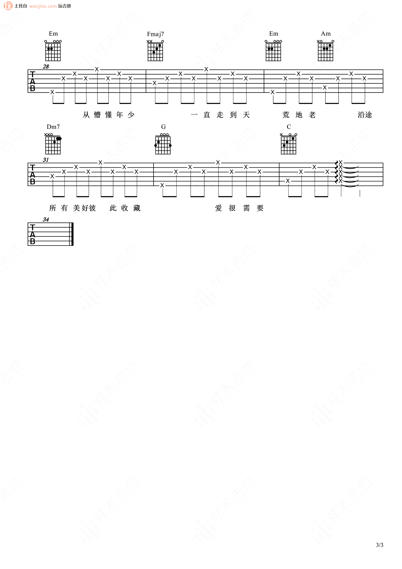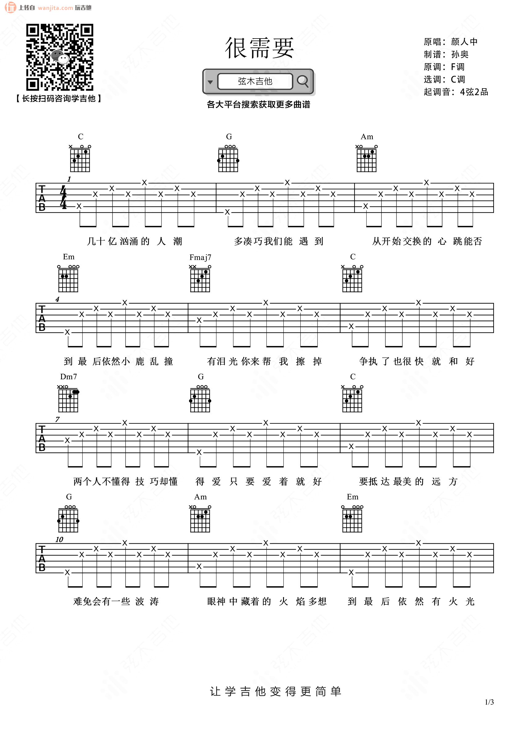 曲谱介绍: 《很需要》这首曲谱由弦木音乐编配制谱,总共3张高清图片谱,原调是F调,选用C调指法编配,变调夹夹4品可以弹唱原调,曲谱弹唱比较简单,非常标准的分解和弦,适合新手练习。
