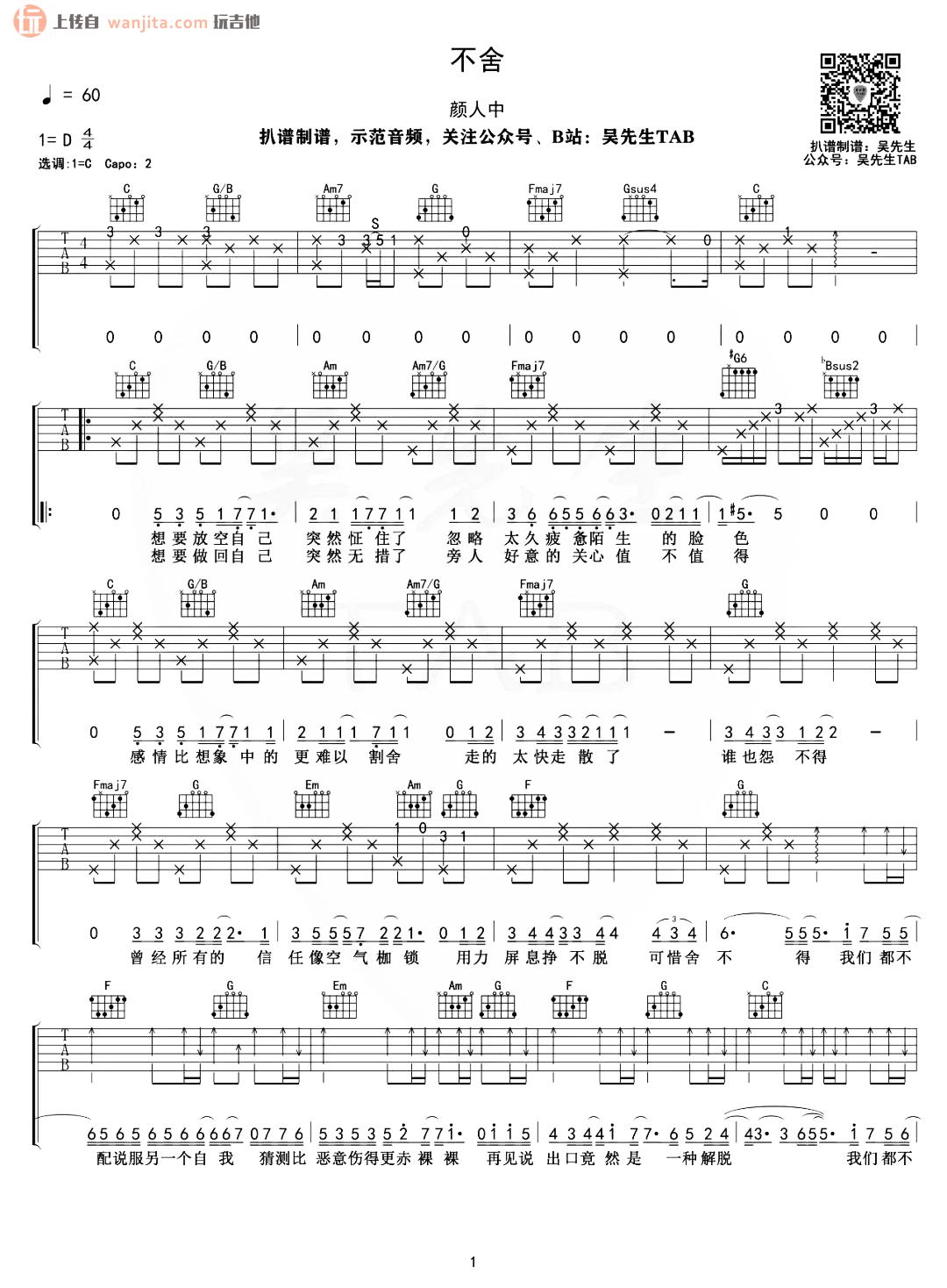 不舍吉他谱 - 颜人中 - C调吉他弹唱谱