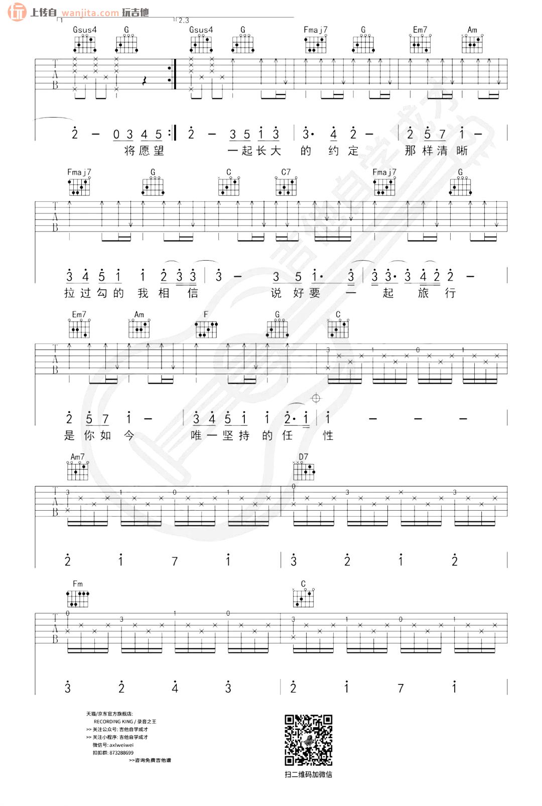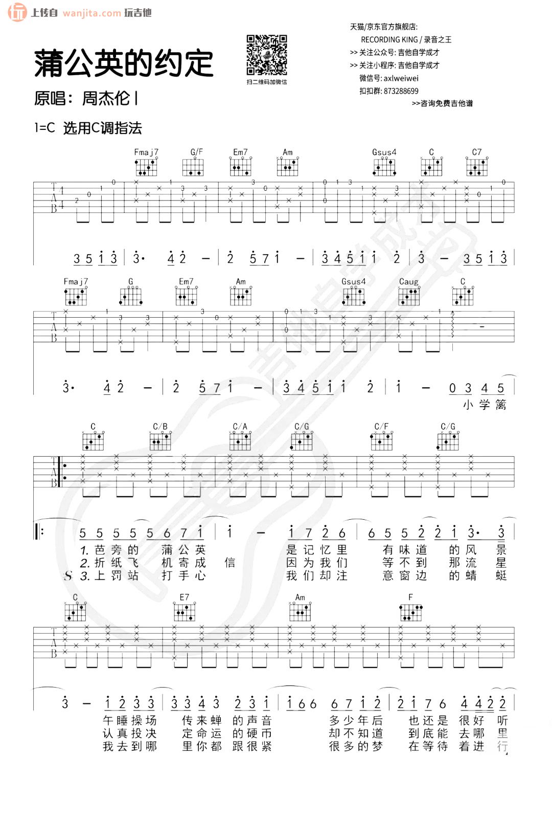 曲谱介绍: 《蒲公英的约定》吉他弹唱谱,总共3张高清图片谱例,由王唯安(安仔)制谱分享。原调C调,选用C调指法,不使用变调夹。这首歌曲的曲谱比较难学,不推荐新手学习,大家在练习的时候需要注意和弦的变换和歌曲节奏的把控。