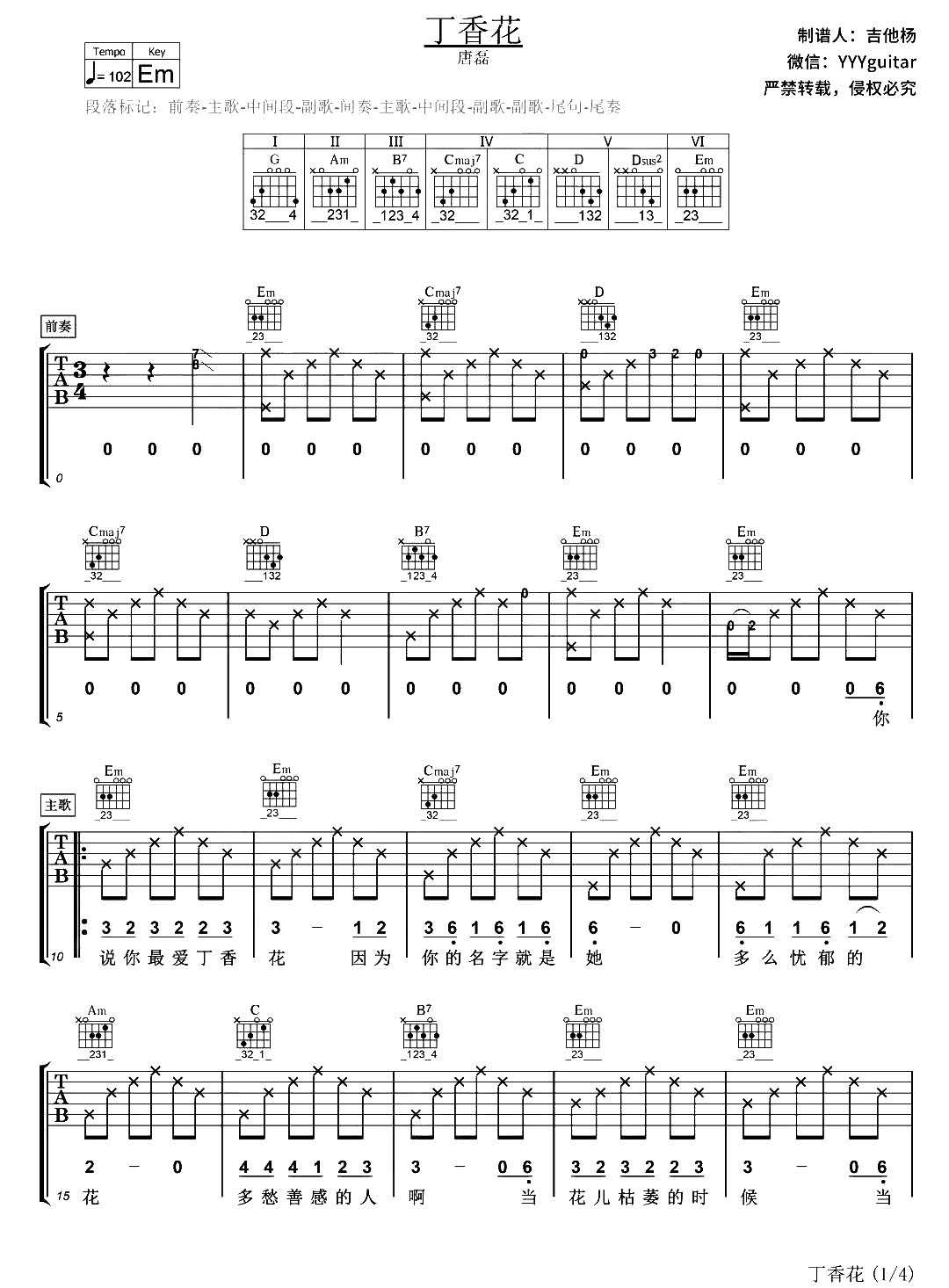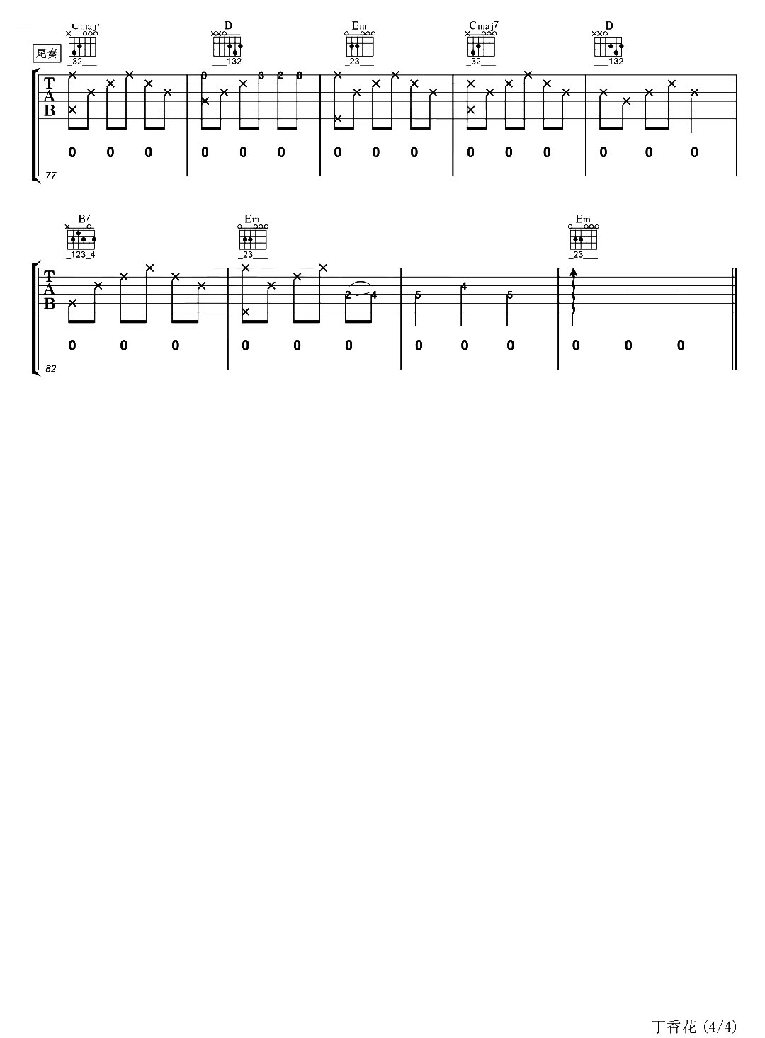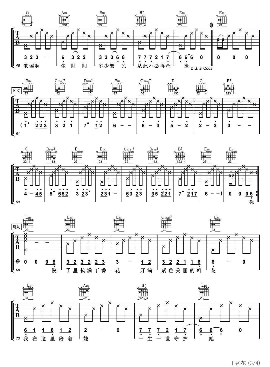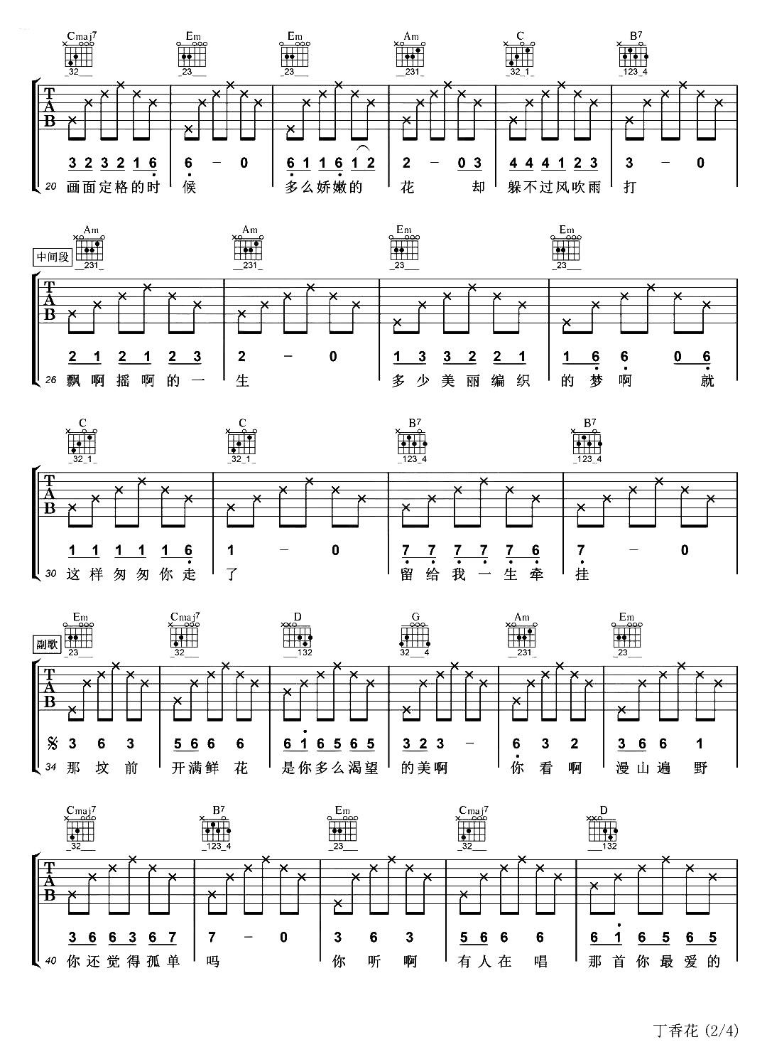 曲谱介绍: 唐磊《丁香花》吉他弹唱谱,采用E调指法编配原版,共有4张高清图谱。