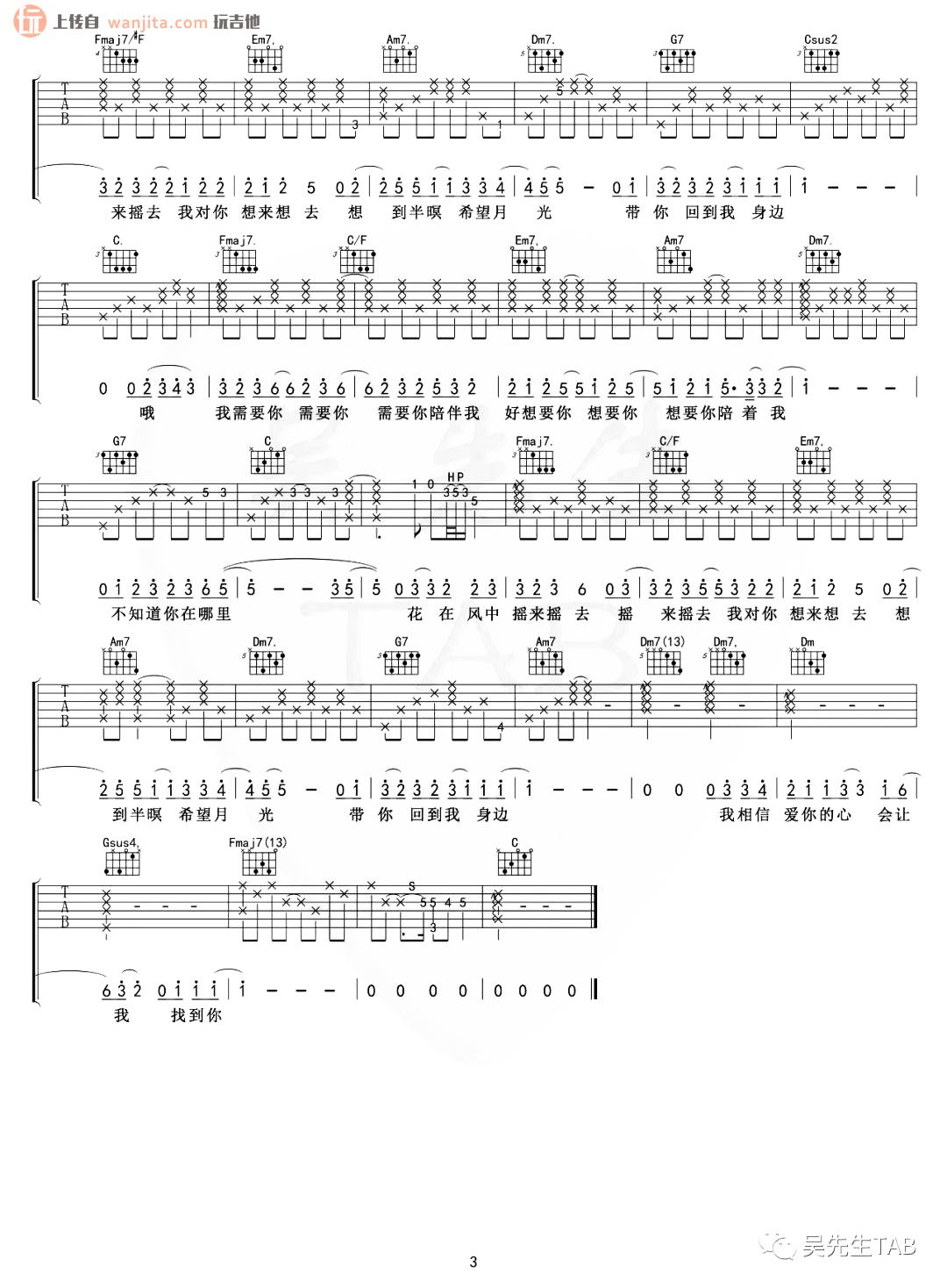 曲谱介绍: 这首曲谱总共3张高清图片谱例,由吴先生制谱分享,原调B调,选用C调,降半音调弦,曲谱包含了吉他弹唱的演示音频,建议感兴趣的朋友参考结合练习。这首歌曲虽然朴素且真诚,但是对于新手来说,弹唱起来并不简单,不推荐新手学习,大家练习的时候需要注意歌曲的和弦变化。