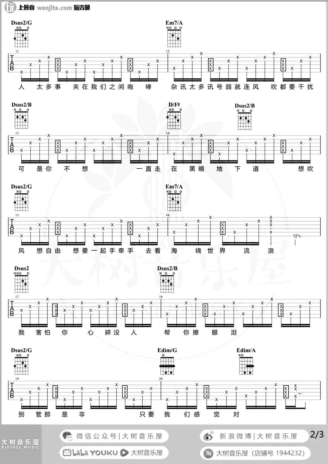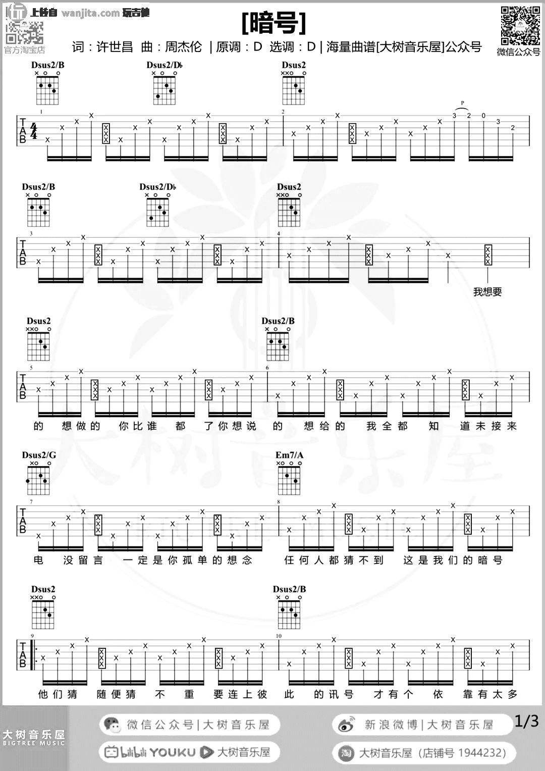 曲谱介绍: 《暗号》吉他弹唱谱总共3张高清图片谱例,由大树音乐屋制谱分享,原调D调,选用D调,不使用变调夹,女生可以将变调夹夹在3品,具体可以参考下方的弹唱视频。这首歌曲弹唱主要是以拍弦节奏为主,难度不算太大,适合新手学习的一张曲谱,大家练习的时候需要注意和弦的变化。 《暗号》吉他弹唱演示视频