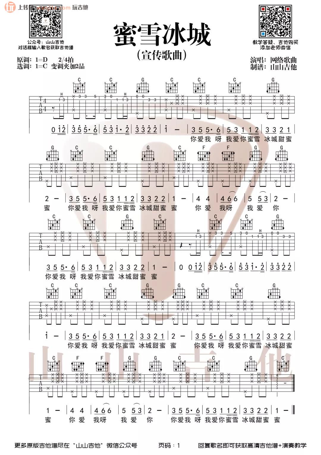 曲谱介绍: 这首曲谱由山山吉他编配制谱,原调D调,选用C调指法编配,变调夹夹2品,包含完整的前奏,弹唱主要以拍弦核心的节奏,整体来说还是十分好上手弹唱的,感兴趣的朋友可以参考演示视频。 《蜜雪冰城甜蜜蜜》吉他弹唱演示视频