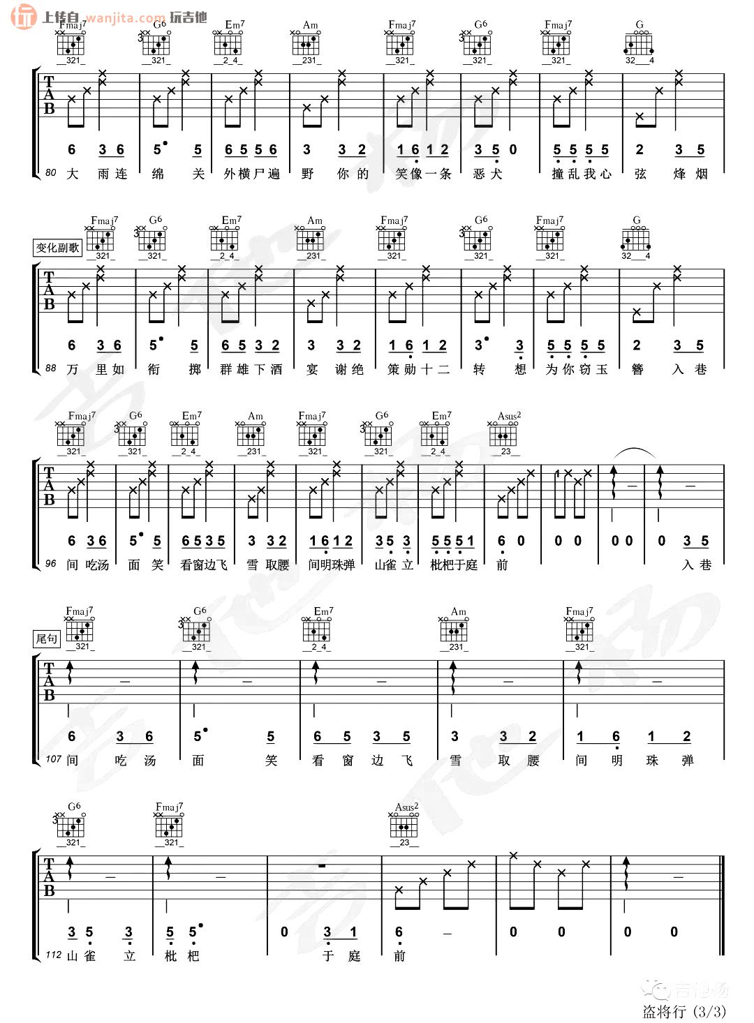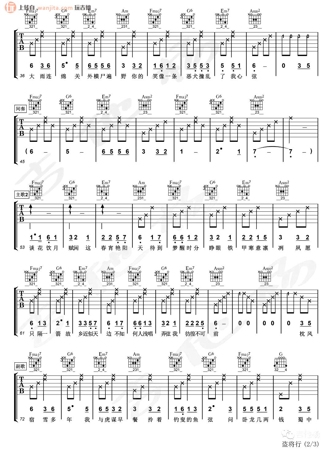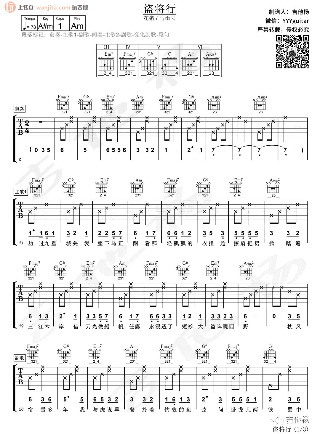 曲谱介绍: 《盗将行》吉他谱,原调#A,选用A调,变调夹夹1品。简单的和弦,基础的节奏,特别适合新手学习的一张谱子,大家需要注意歌曲歌词唱起来的节奏感和层次感,推荐使用节拍器。总共3张高清图片谱例,由吉他杨制谱分享。