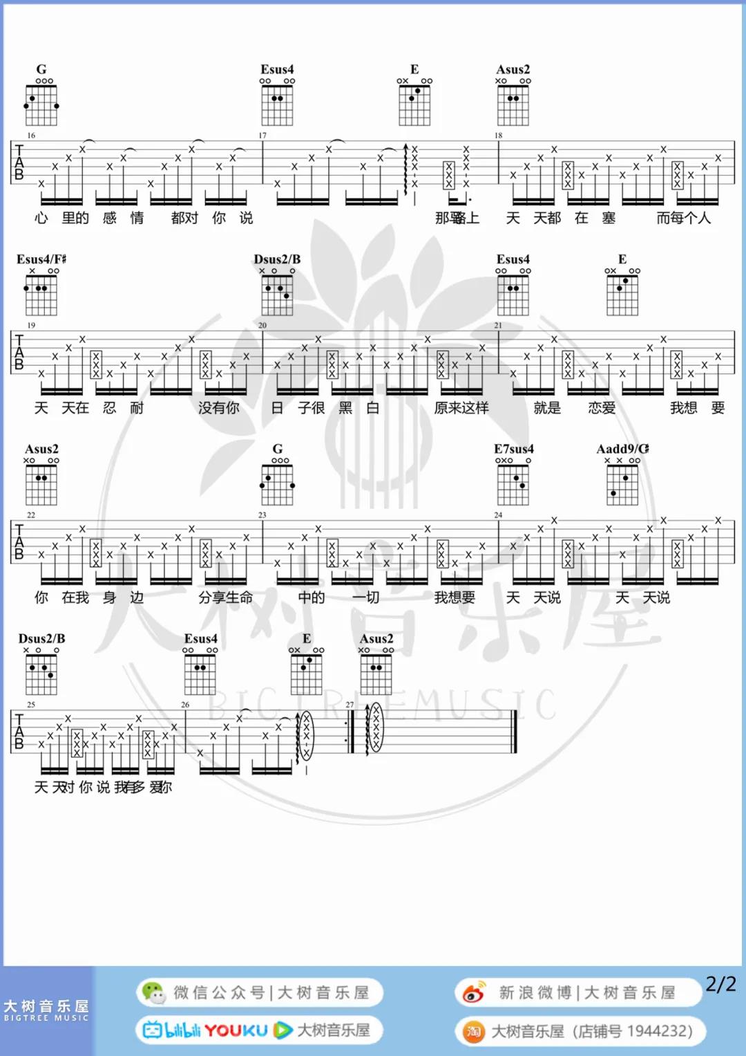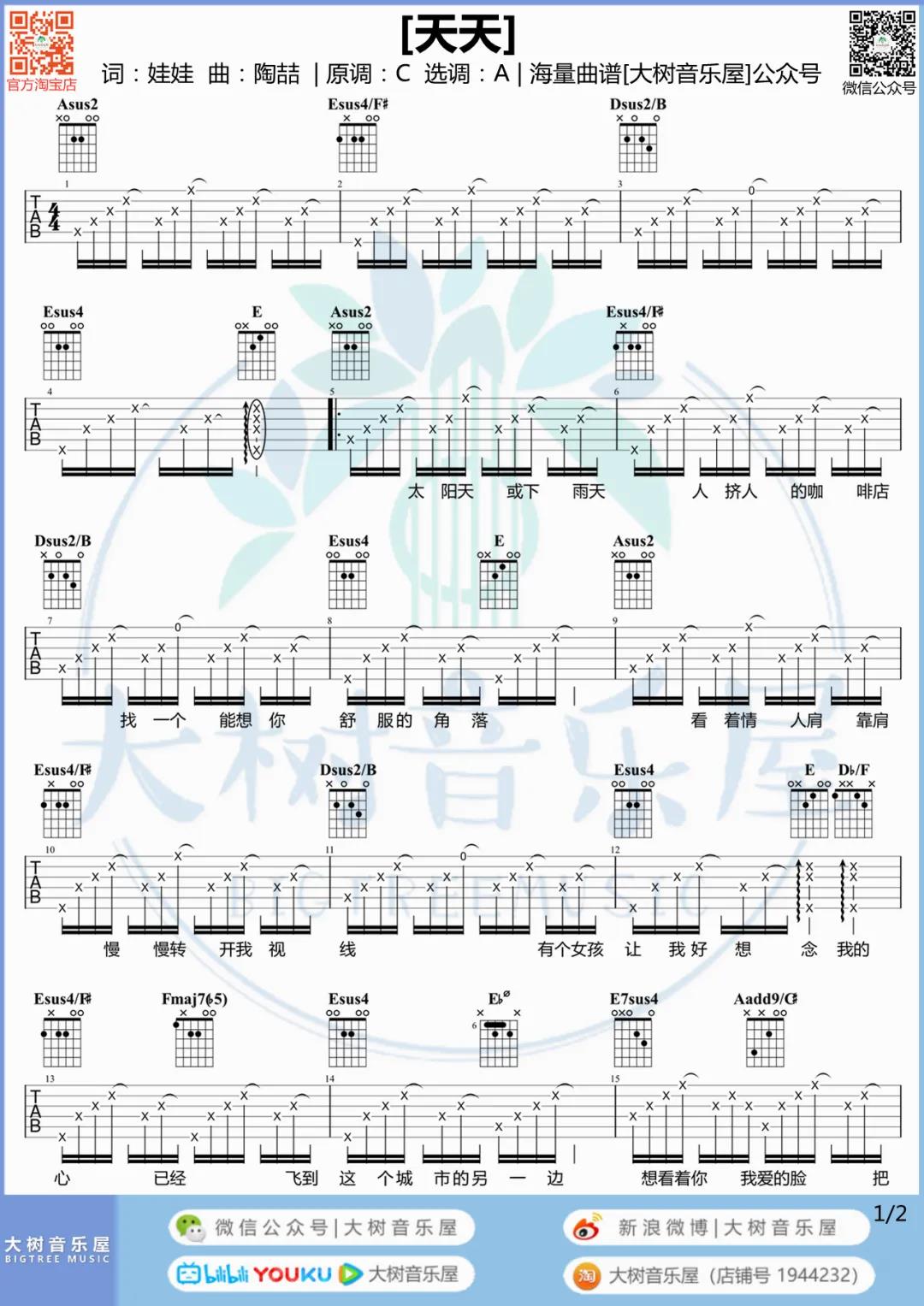 曲谱介绍: 《天天》这首曲谱由大树音乐屋编配制谱,原调是C调,选用A调指法,下方有女生的版本弹唱演示,整体难度不算大,感兴趣的朋友请参考视频进行弹唱练习哦。 《天天》吉他弹唱演示视频