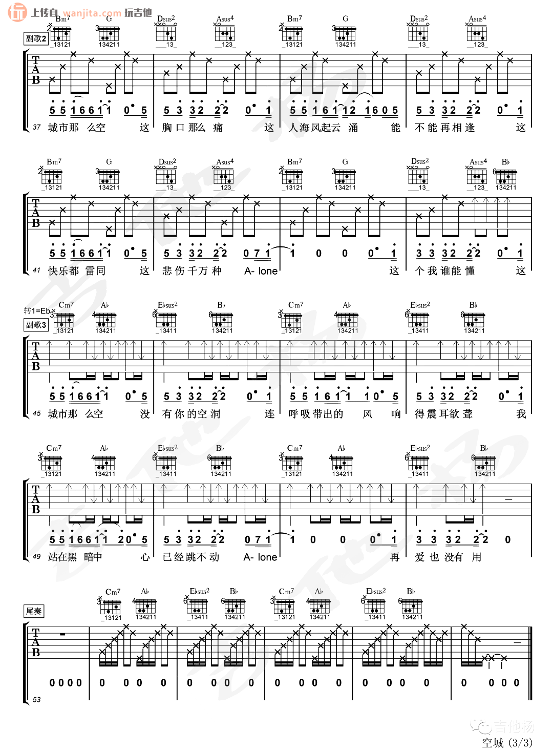 曲谱介绍: 这首曲谱总共3张高清图片谱例,由吉他杨制谱分享。原调E调,选用D调,变调夹夹1品。弹唱还是有一定的难度,不推荐新手学习,不过这首歌实在是太适合吉他弹唱了。吉他的深情和悲伤的男人特别配,特别适合一个人弹唱。