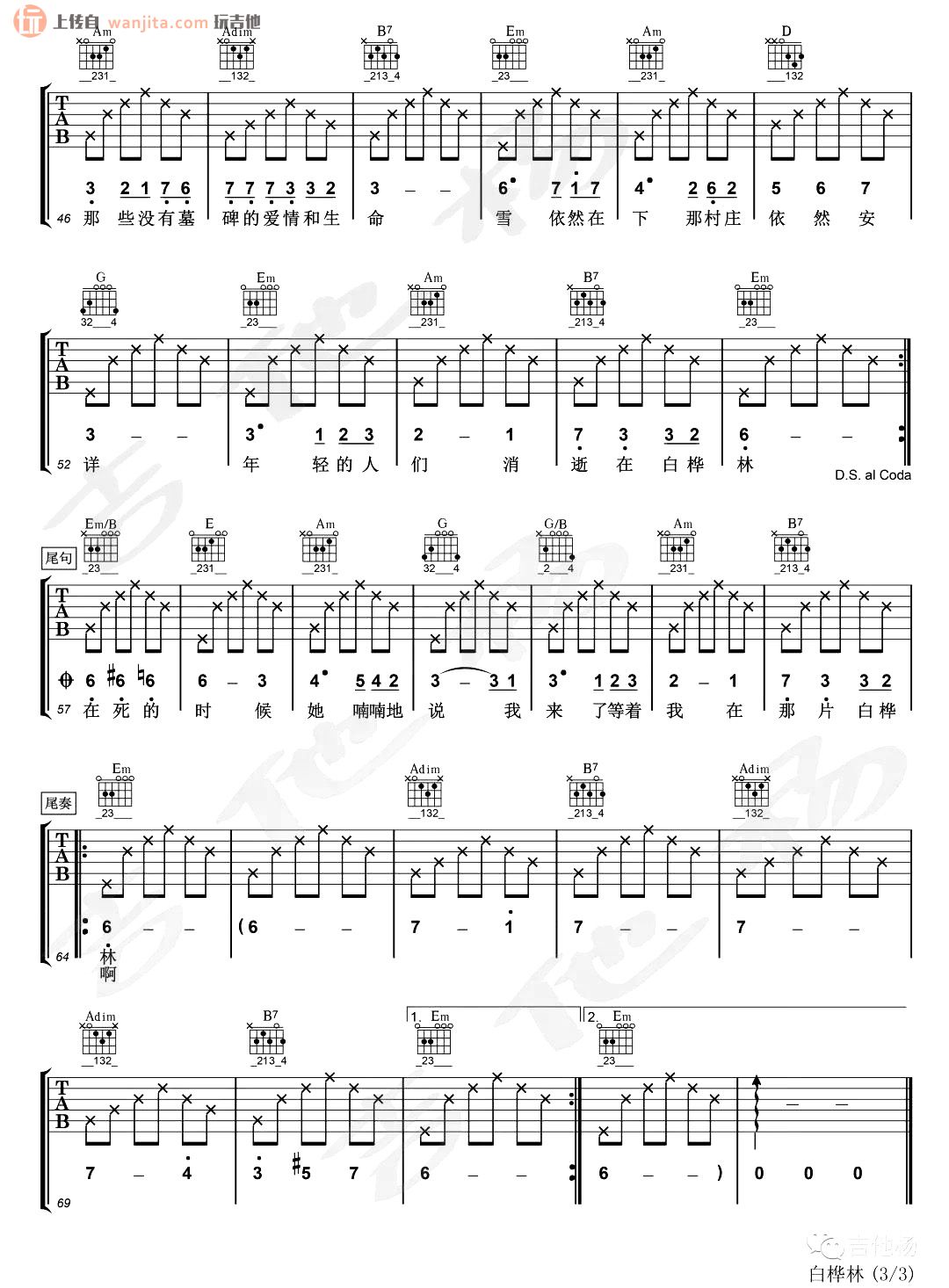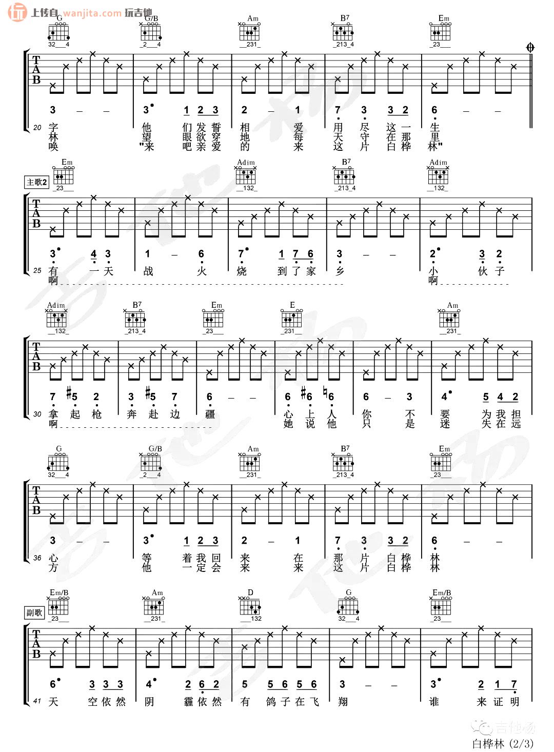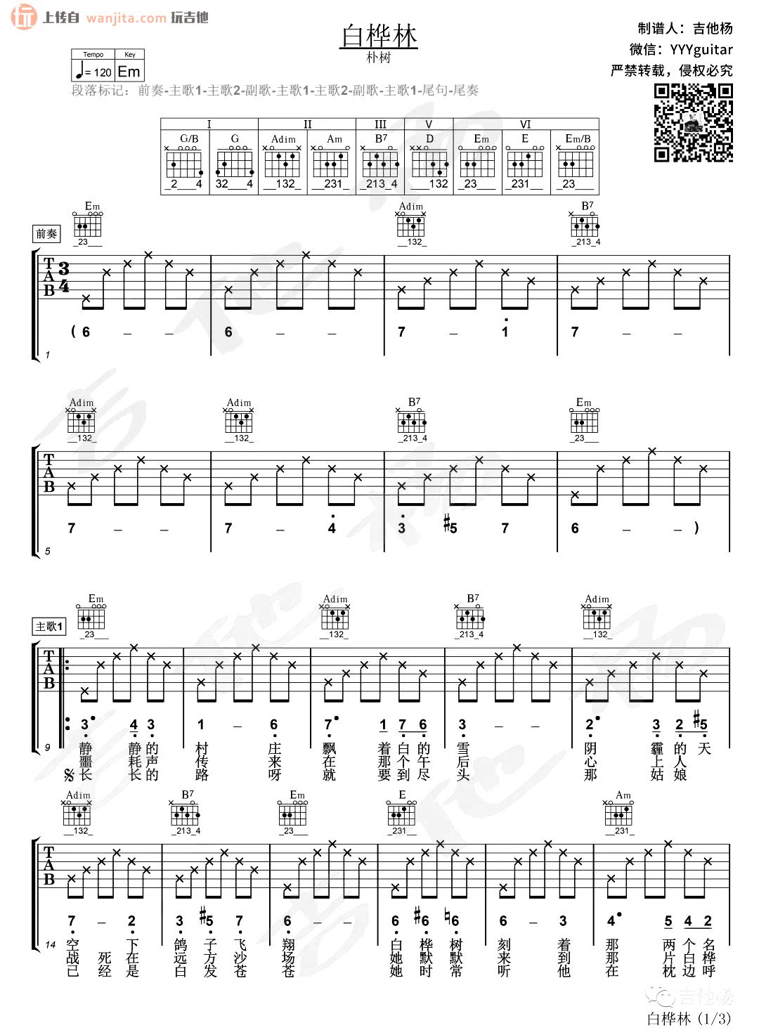 曲谱介绍: 白桦林这首吉他弹唱谱,总共3张高清图片谱例,由吉他杨制谱分享。选用E调,不使用变调夹。前奏悠扬且容易学习,一些比较容易学习的和弦,就算是新手也可以很好的学会这首歌曲,作为朴树的代表作,推荐大家学习这首歌曲。