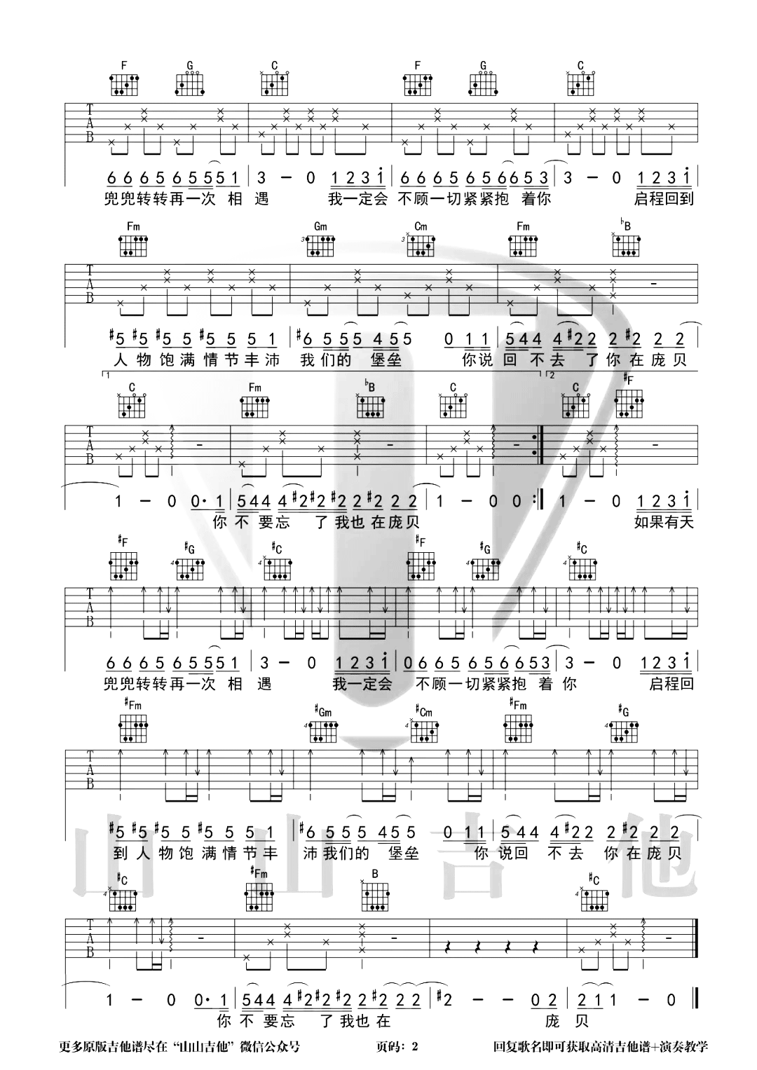 曲谱介绍: 这首曲谱是由山山吉他编配制谱,总共2张高清图片谱,弹唱难度不大,主要右手节奏型以半分解和弦为主,副歌则以扫弦弹唱,感兴趣的朋友可以试着练习,弹唱的整体效果还是不错的。