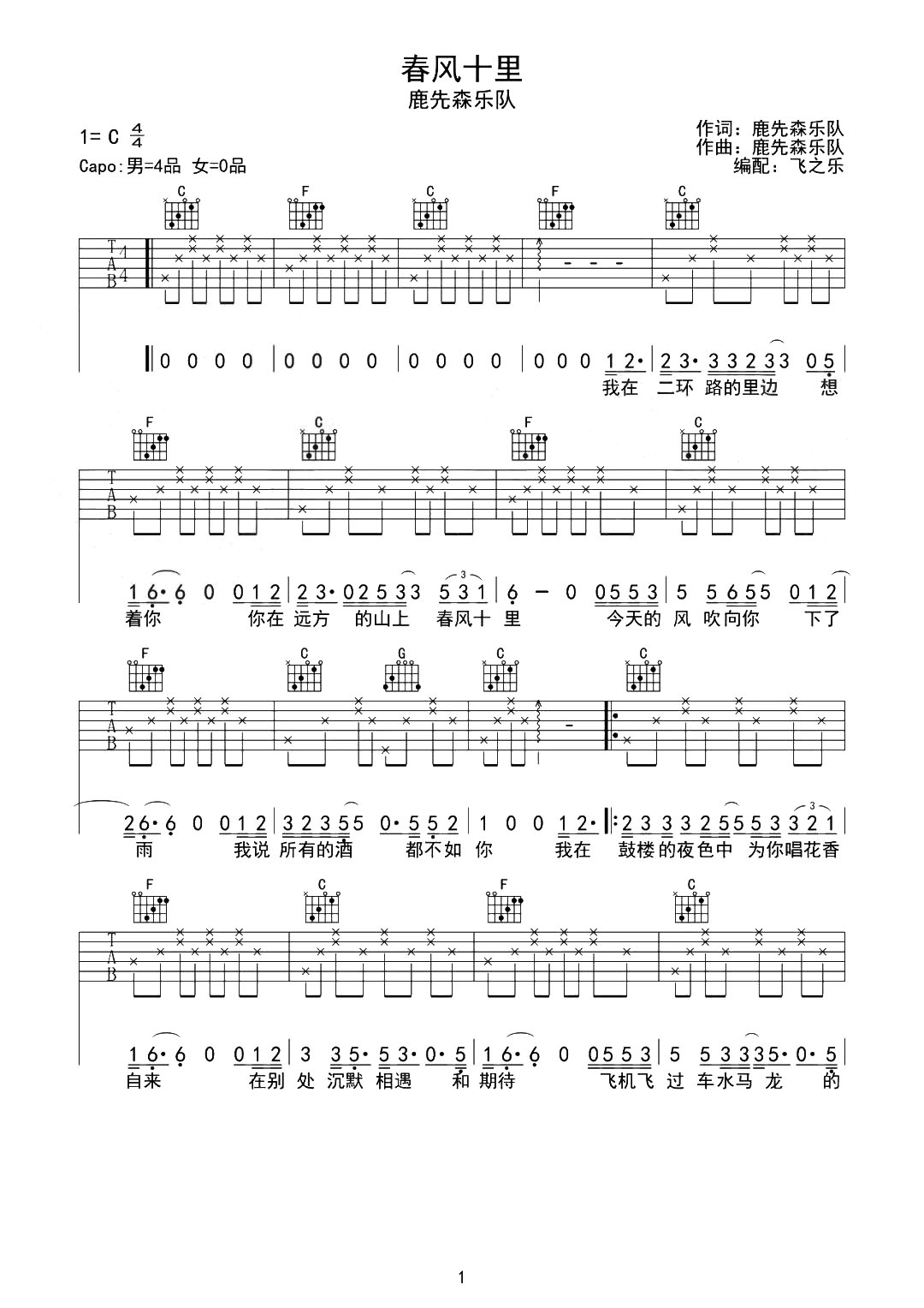 春风十里吉他谱 - 鹿先森乐队 - C调吉他弹唱谱