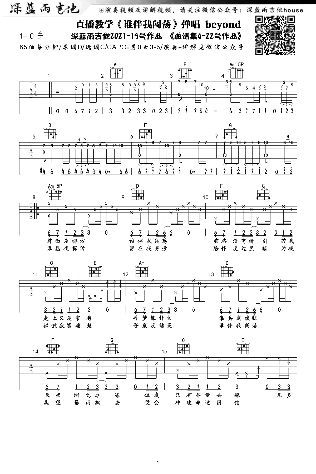 曲谱介绍: 这首曲谱是深蓝雨编配并制谱,总共3张高清图片谱,弹唱节拍65拍每分钟,原调是D调,选用C调指法,标准调音,男声不用变调夹,女生可以3-5品。这个版本较难,但是弹唱的还原度较高,感兴趣的朋友可以结合弹唱演示视频练习,更利于上手。 《谁伴我闯荡》吉他弹唱演示视频