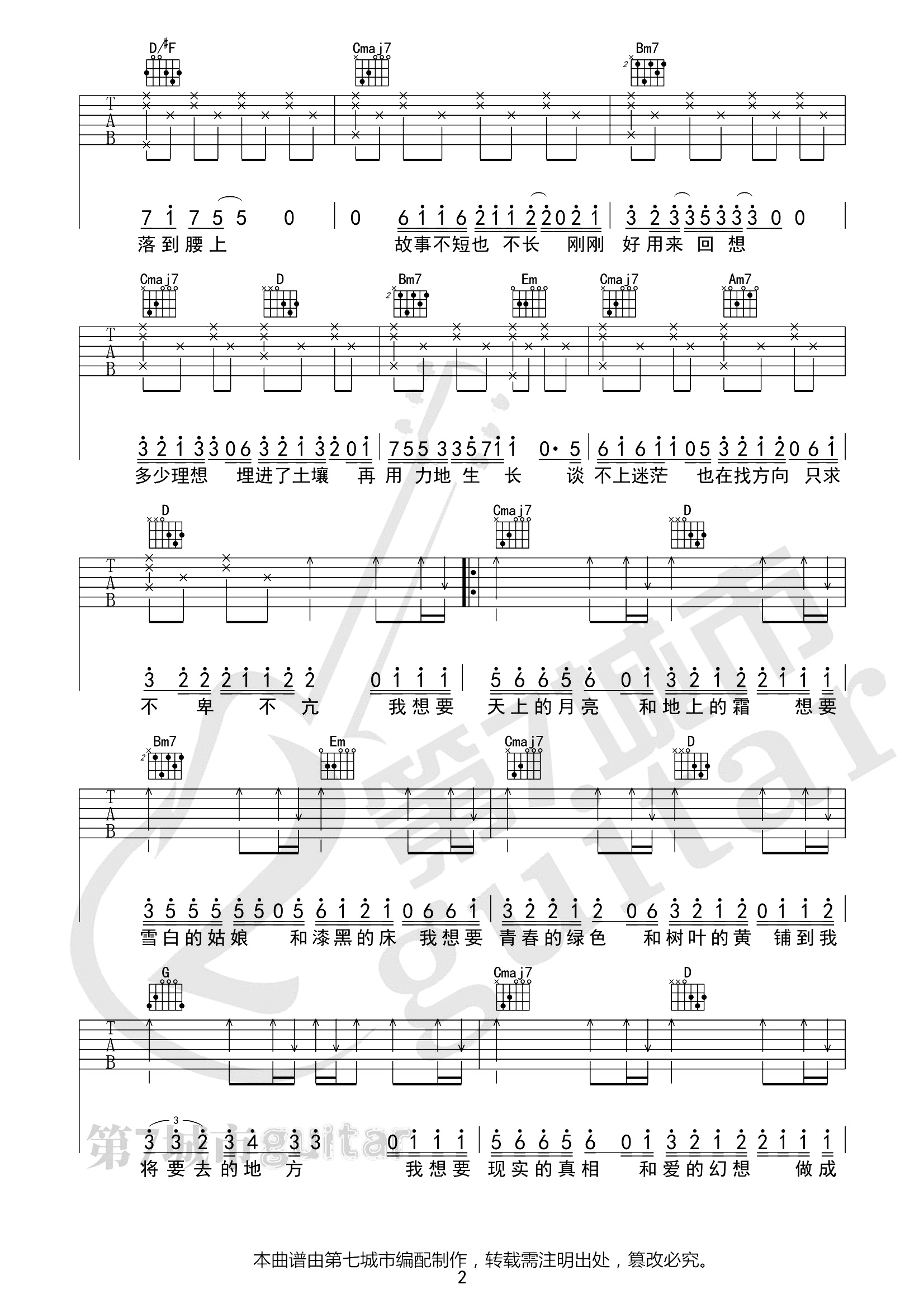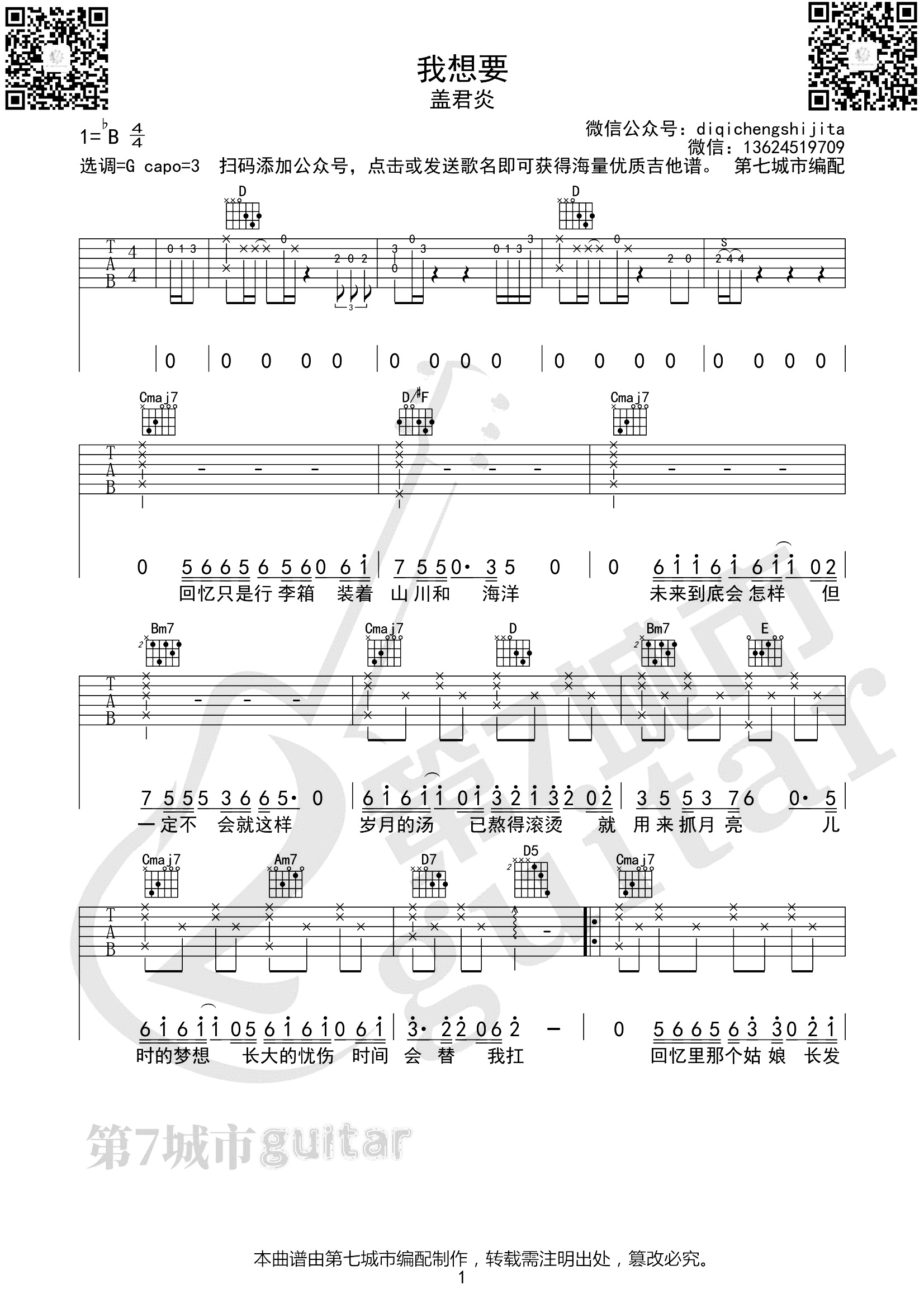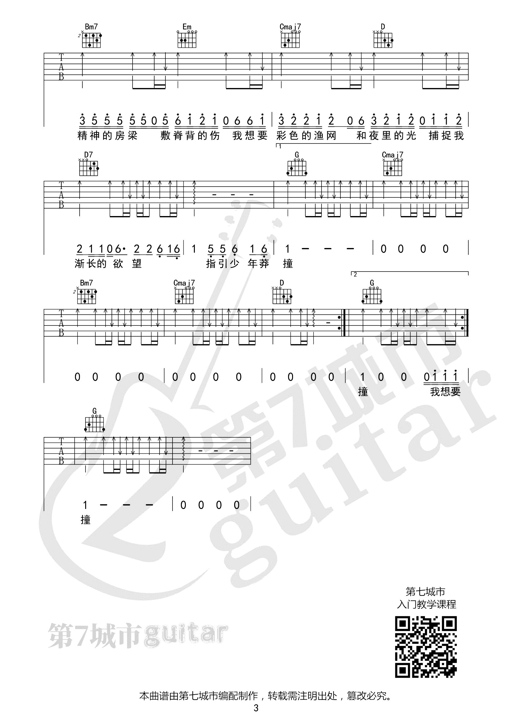 曲谱介绍: 这首曲谱由第七城市编配制谱,总共3张高清图片谱,包含完整的前奏部分,原调是bB,选用G调指法,主副歌的弹唱指法难度并不算大,感兴趣的朋友可以听听随附的吉他弹唱音频。