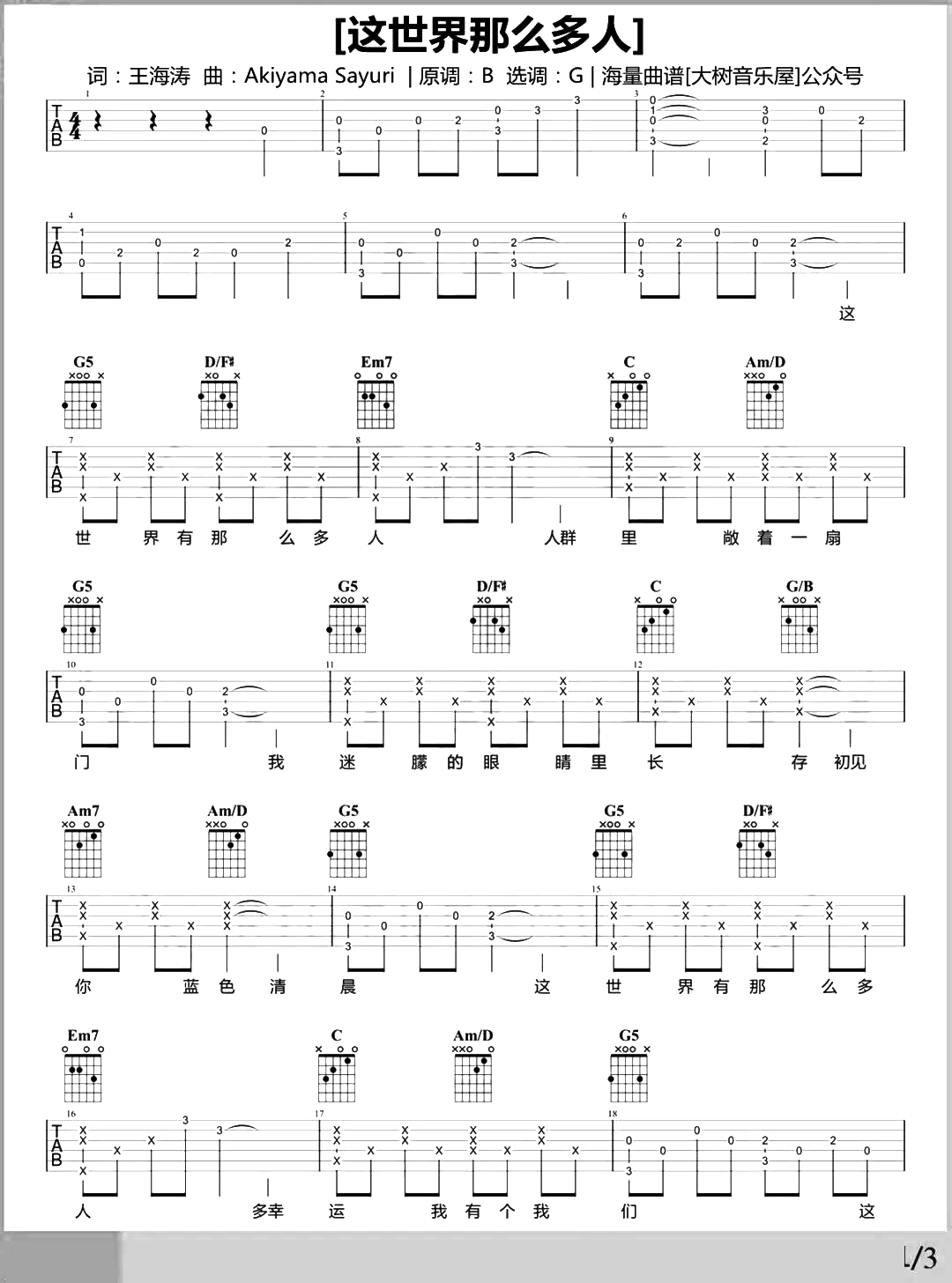 曲谱介绍: 《这世界那么多人》吉他弹唱演示视频