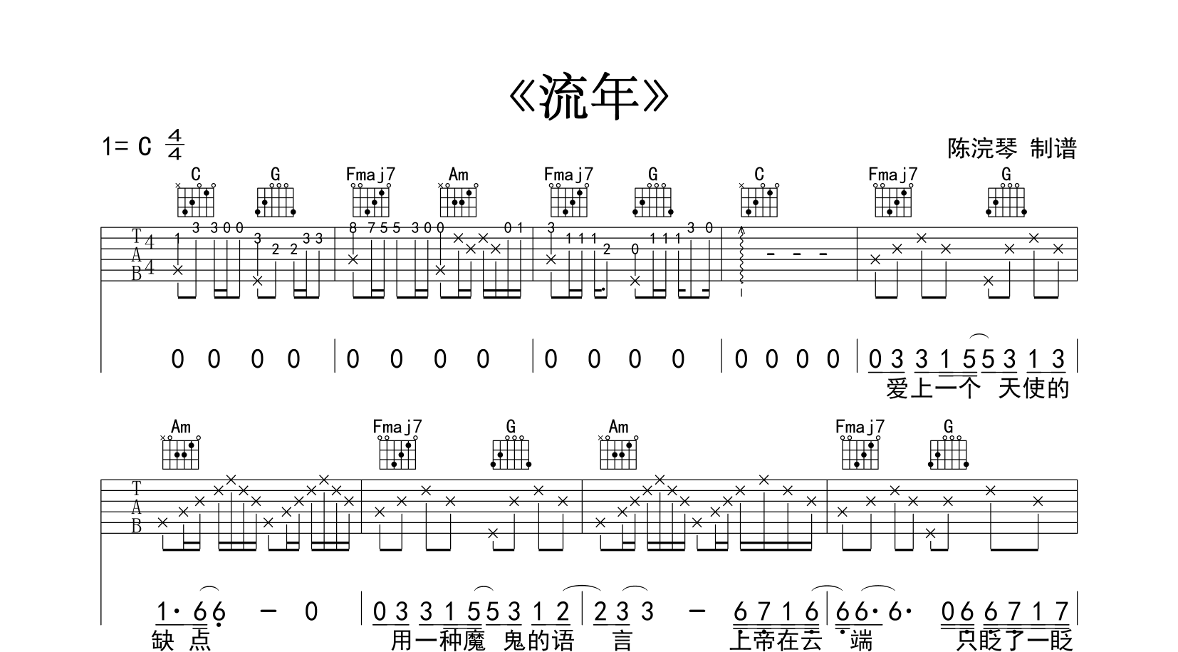曲谱介绍: 流年吉他谱,王菲演唱的一首歌,《流年》吉他弹唱谱,共有两张图片谱,选用C调编配吉他谱,标准调音可不用变调夹弹唱,难度简单,本谱由@陈浣琴制谱上传。