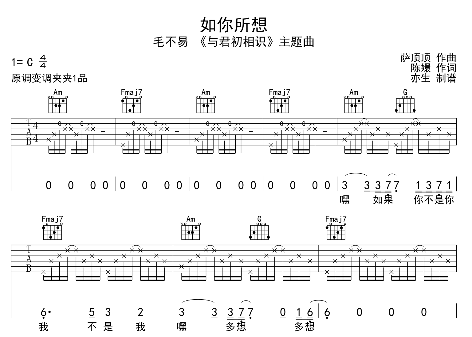 曲谱介绍: 如你所想吉他谱,毛不易演唱的《与君初相识》主题曲,《如你所想》原版六线谱,本吉他谱采用C调指法编配,原调#C,节奏4/4拍,变调夹夹第1品演奏,演奏的速度控制在每分钟95拍左右,指法难度简单。