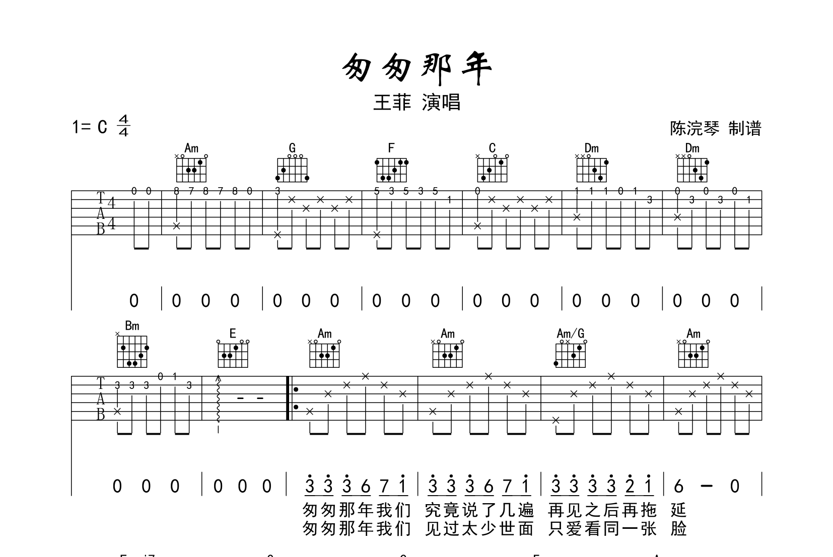 曲谱介绍: 匆匆那年吉他谱,王菲演唱的经典青春校园歌曲,《匆匆那年》原版六线谱,共三张图片谱,谱子为C调编配吉他谱,标准调音可根据自己情况调整变调夹,指法简单难度初级,本谱由@陈浣琴制谱上传。