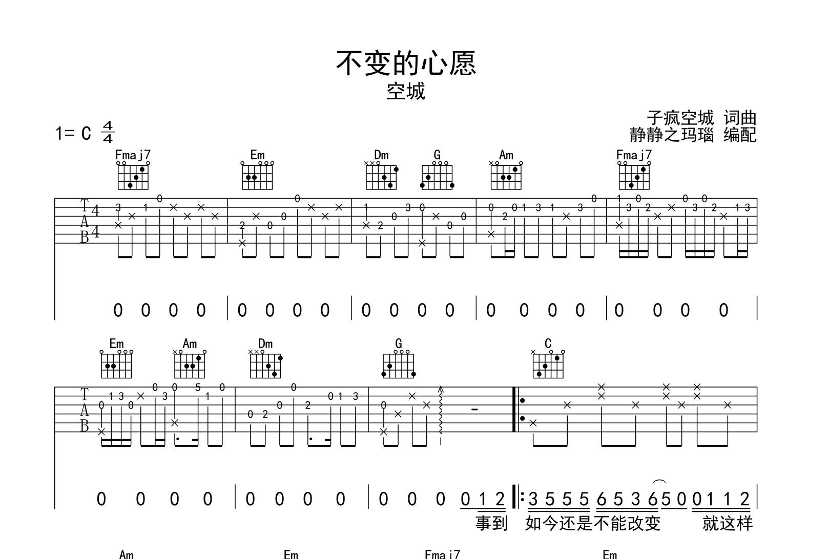 曲谱介绍: 空城《不变的心愿》吉他谱,由@静静之玛瑙制谱,《不变的心愿》吉他弹唱谱,共三张图片谱,本谱采用C调和弦指法编配,节奏4/4拍,曲速85拍每分钟,弹唱建议不夹变调夹,指法简单。