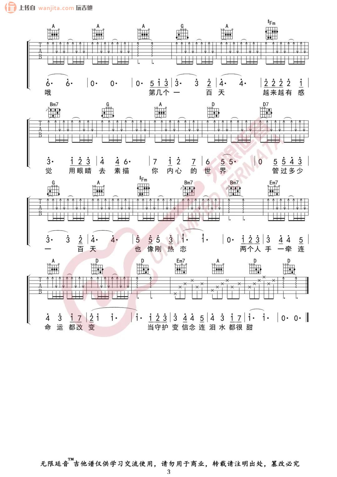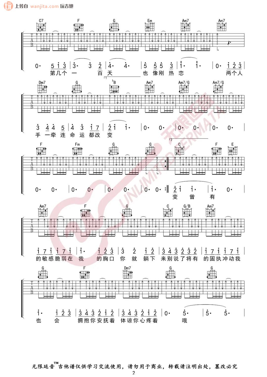 曲谱介绍: 《第几个一百天》吉他谱,选用C调指法编配,由无限延音提供制谱,全入门级分解和弦的方式弹唱,副歌部分扫弦弹唱,节拍更快,需要掌握好节奏不要乱。