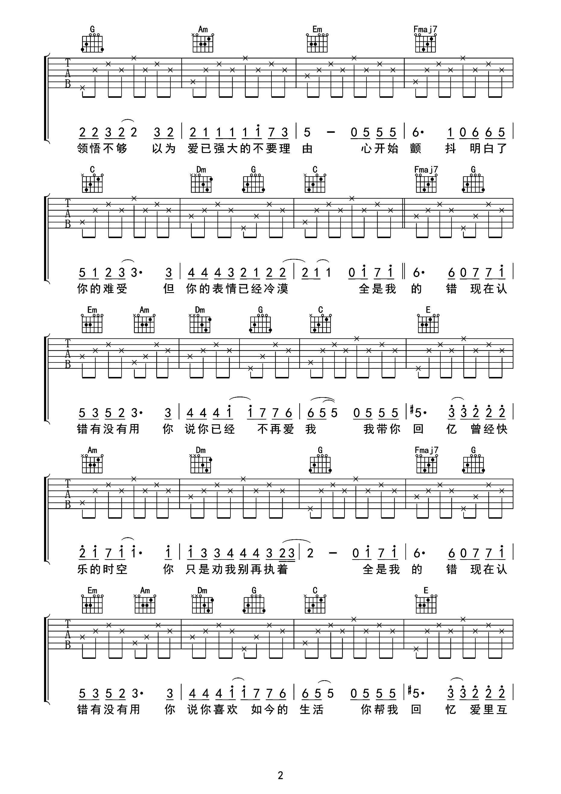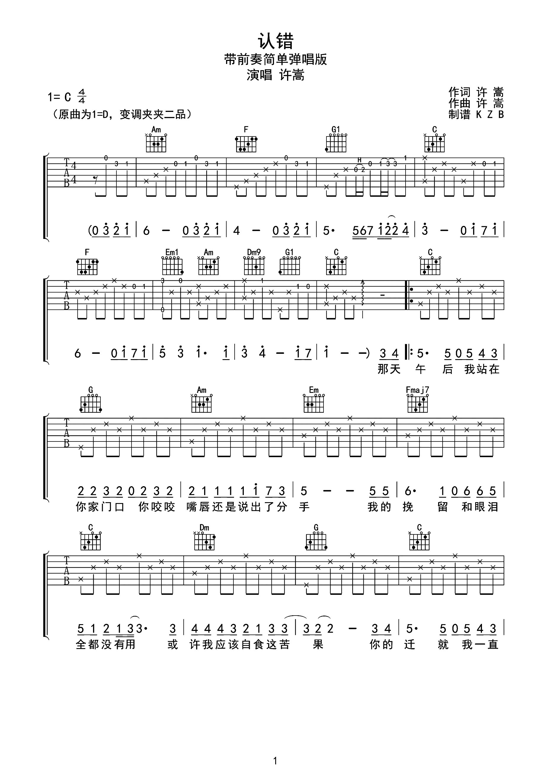 曲谱介绍: 许嵩《认错》吉他弹唱谱,采用C调指法编配,共有3张高清图谱。