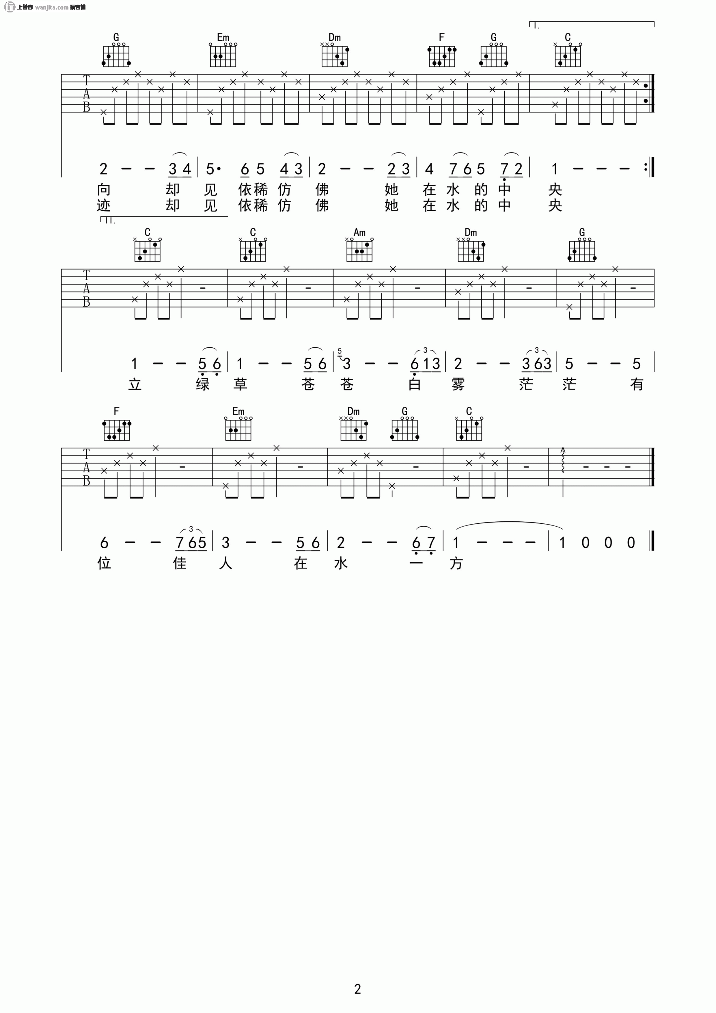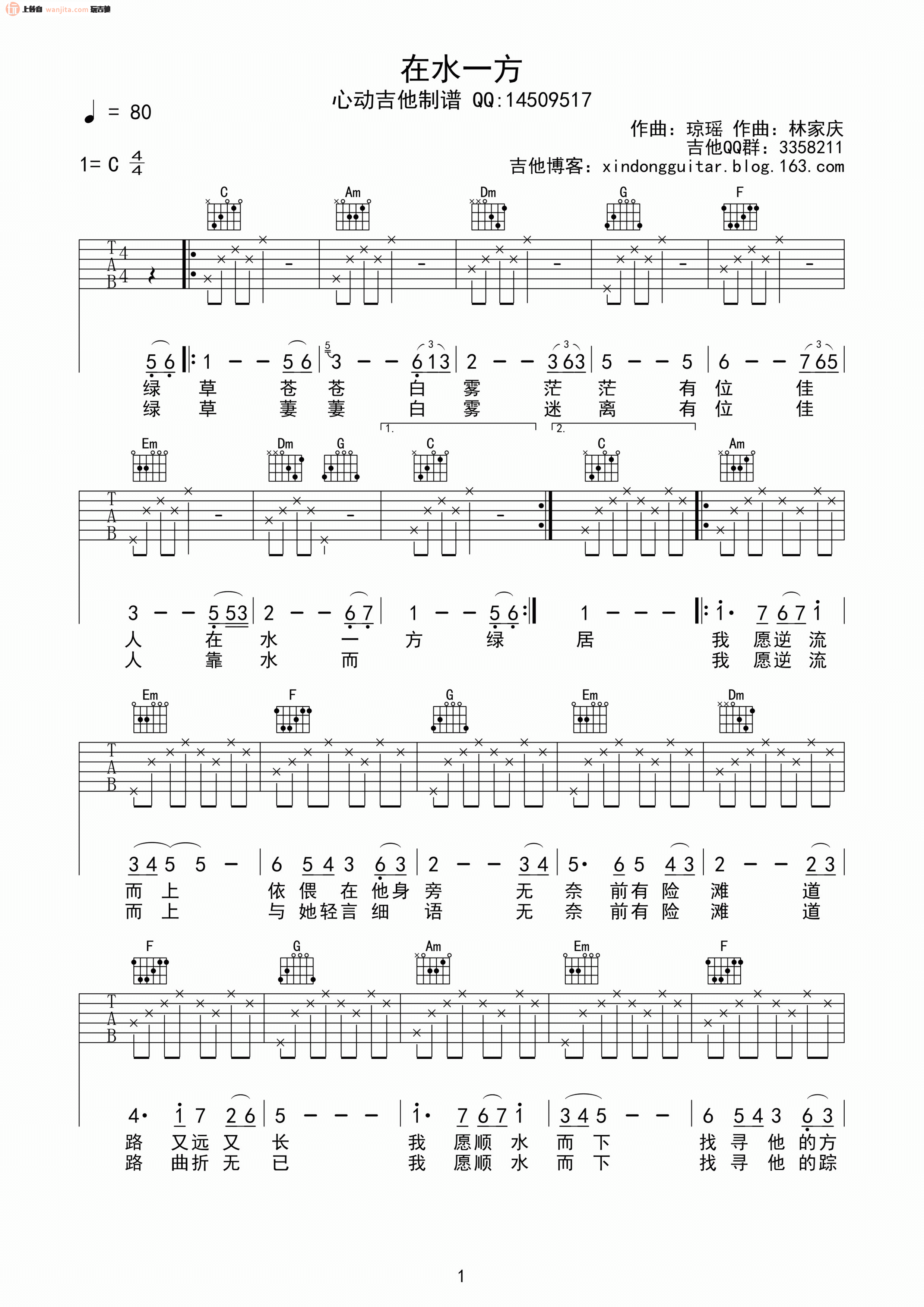 曲谱介绍: 《在水一方》吉他谱,选用C调指法编配制谱,和弦和弹奏都十分的简单,适合新手练习和弹唱。