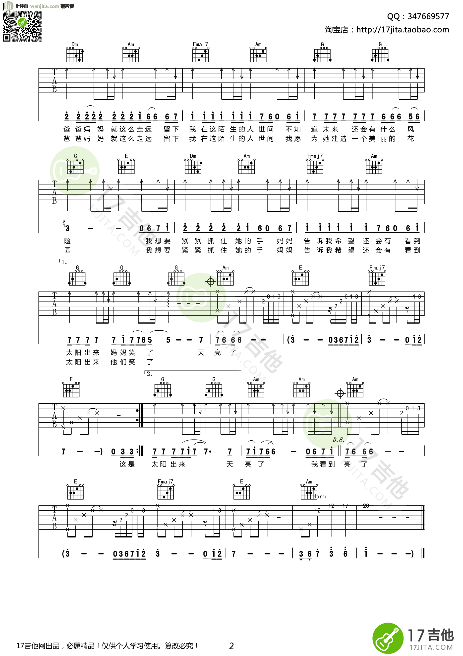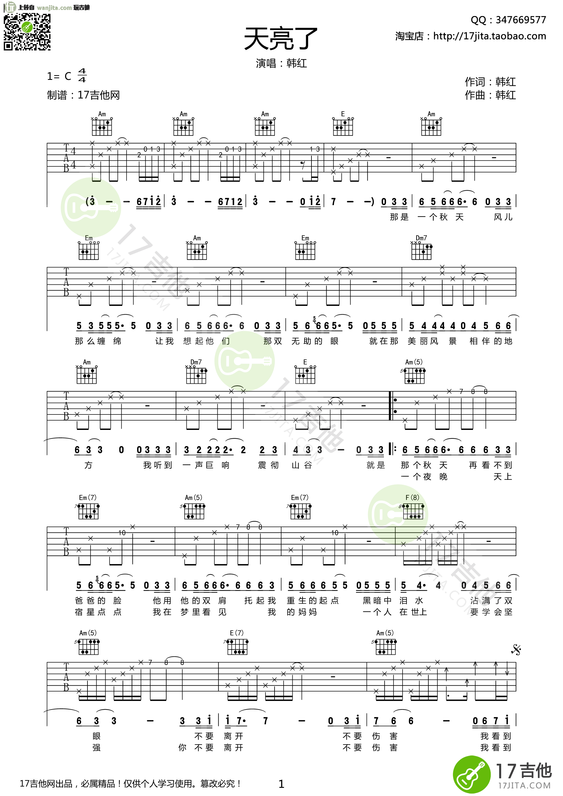 曲谱介绍: 《天亮了》吉他谱,是由17吉他制谱提供,这个版本总共2张高清图片谱,编配完整,选用C调指法,由于原版的音域较高,大家可以根据自己的声音情况,去调整变调夹的位置。