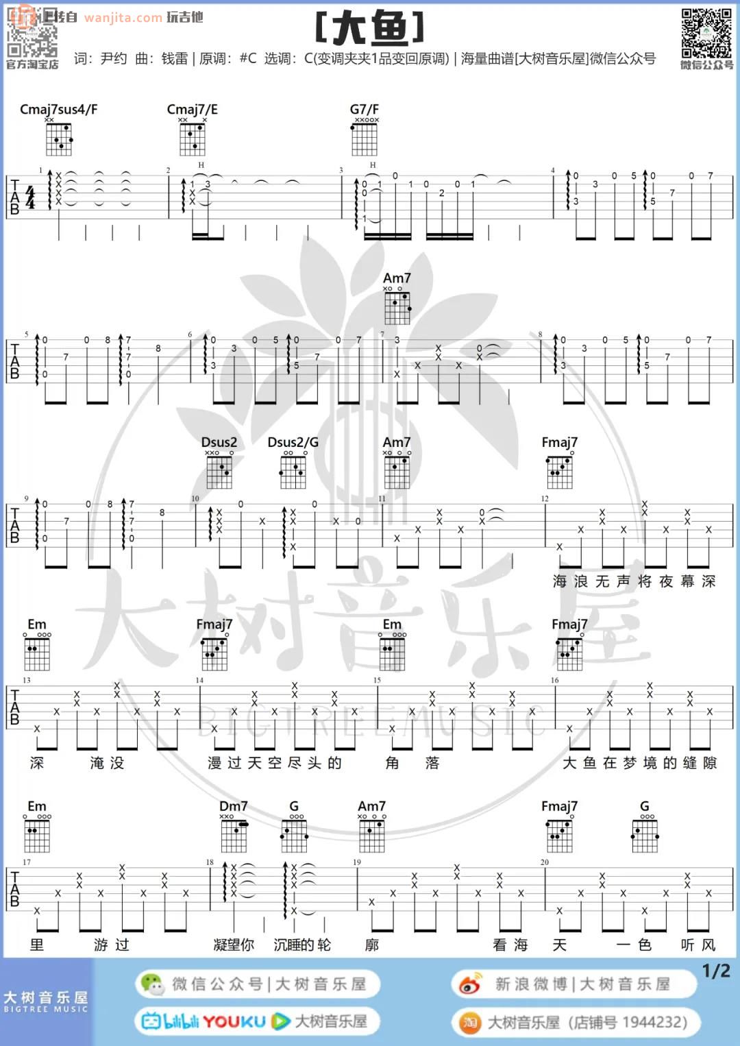 曲谱介绍: 《大鱼》吉他谱由大树音乐屋制谱编配,选用C调指法,原调是#C调,变调夹夹在一品即可弹唱原调,这首歌曲也包含了吉他弹唱演示和教学的视频,大家可以先行参考。 整体来说《大鱼》这个吉他谱的弹唱难度不算很大,可能前奏部分会相对来说更难,不过前奏也是按原版进行的打磨,喜欢的朋友一定要掌握好前奏,会更加完美。 《大鱼》吉他弹唱视频示范 《大鱼》吉他弹唱教学视频