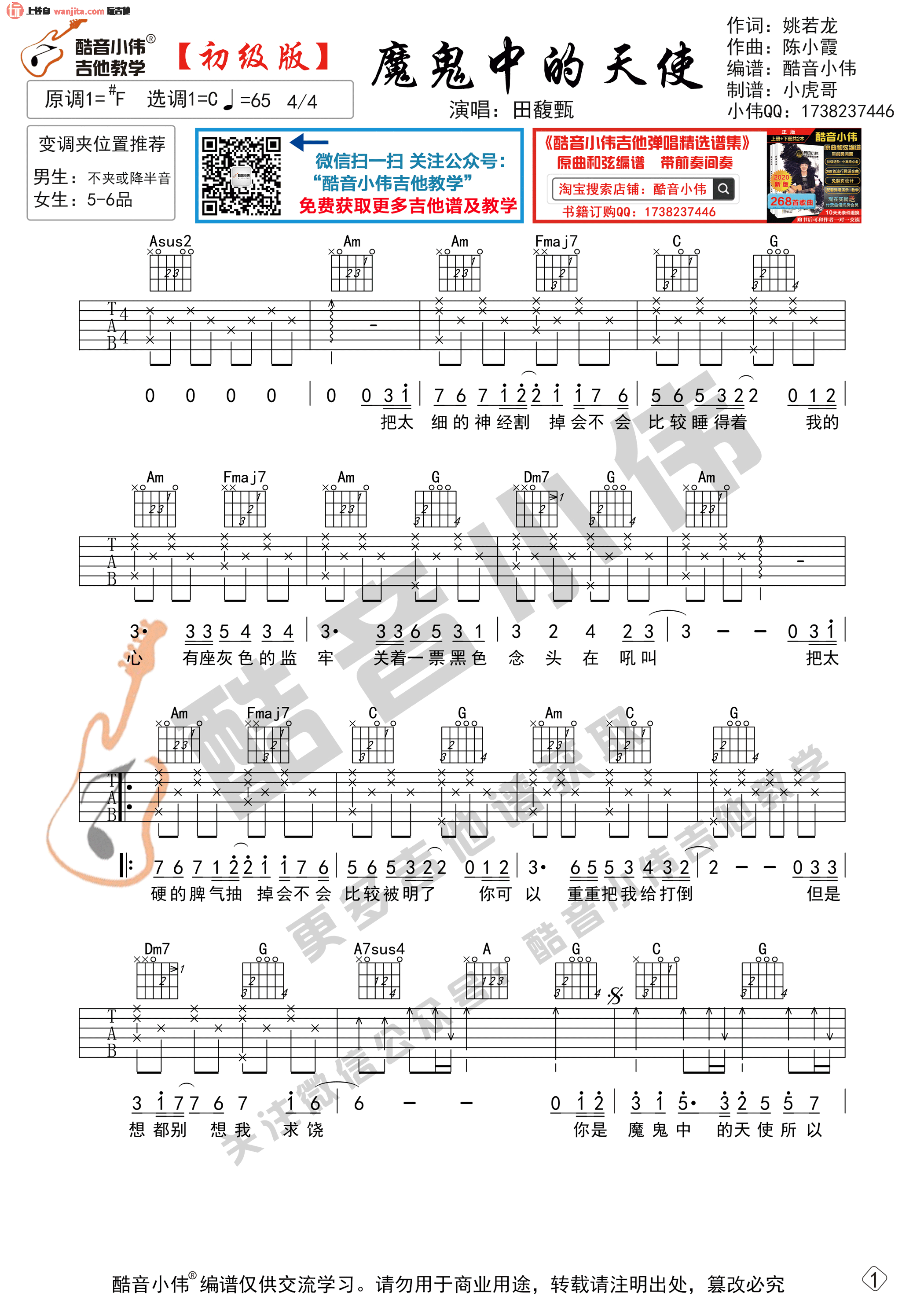 曲谱介绍: 《魔鬼中的天使》吉他谱原调是#F,选用C调指法弹唱,男声可以选择不夹或者将半音条线,女生5-6品弹唱可能会更加合适,这个版本为新手弹唱的简单版本,喜欢的朋友可以尝试练习。