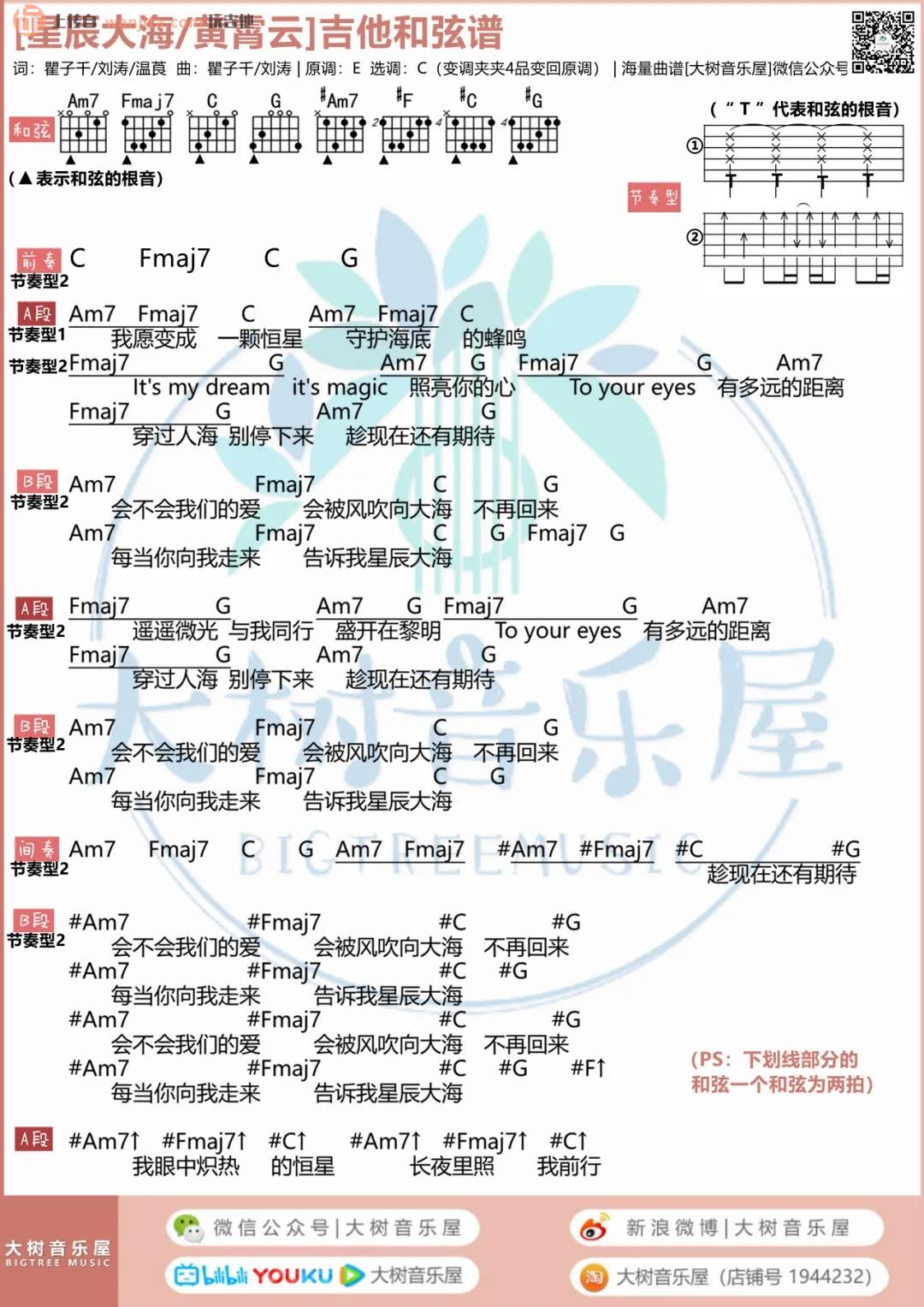 曲谱介绍: 《星辰大海》吉他谱由大树音乐屋编配分享,原调是E调,选用C调指法编配,变调夹夹4品即可弹唱原调,这个版本主要是和弦谱,节奏与和弦指法都已标注,弹唱难度不大。