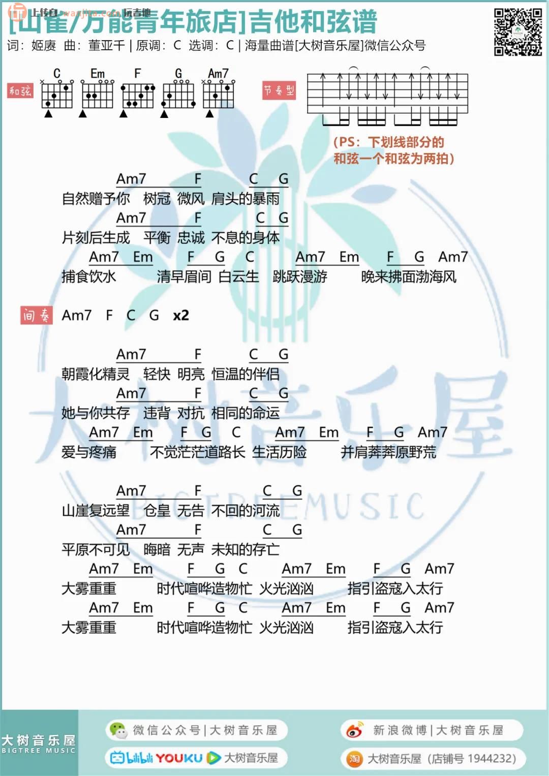 曲谱介绍: 《山雀》吉他谱_和弦谱,由大树音乐屋编配制谱,这首歌原调是C调,选用C调指法编配,弹唱难度不大,总共用到5个和弦,主要都以扫弦节奏为主,和弦谱包含了扫弦的示意图,大家可以参考。