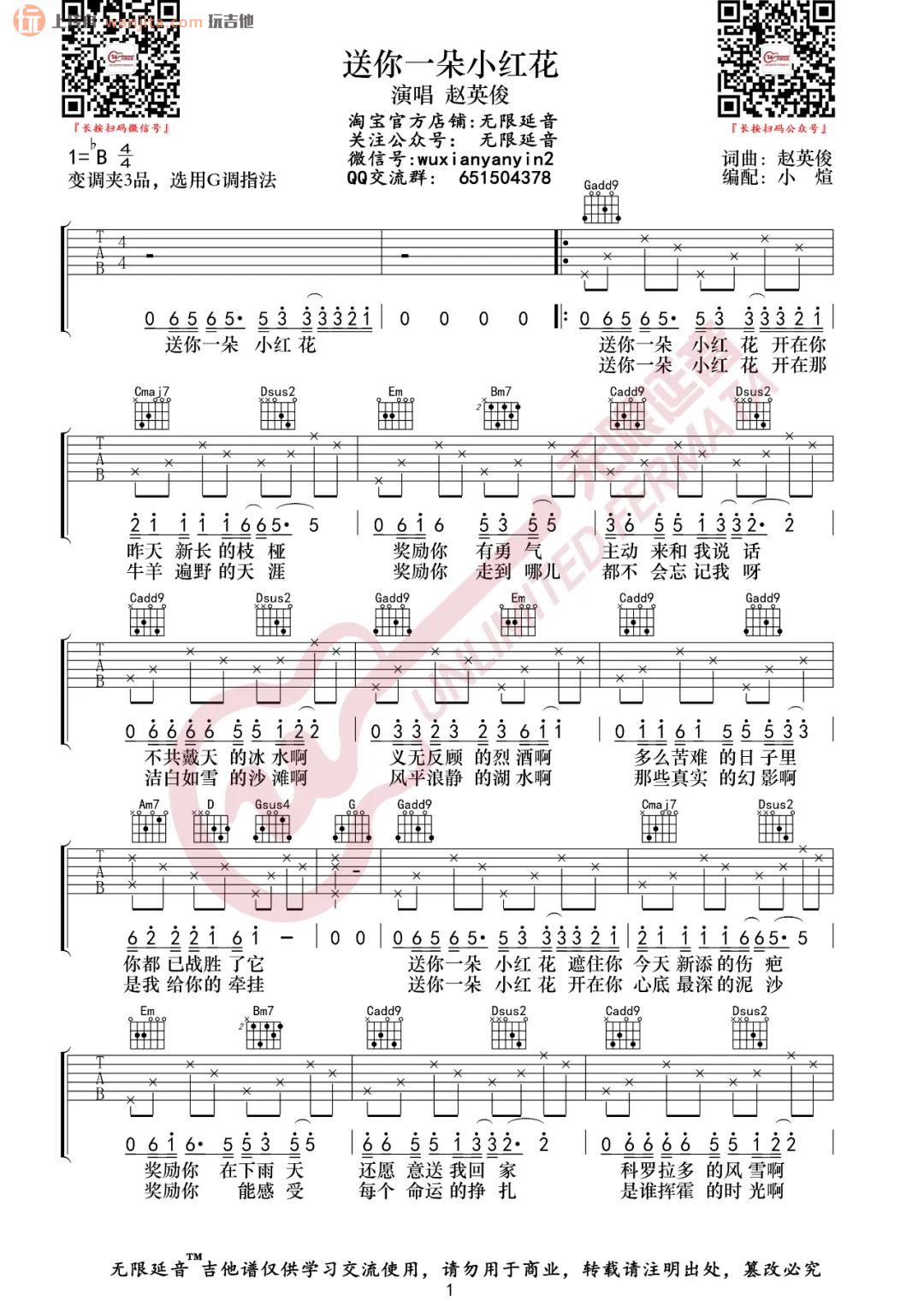 曲谱介绍: 《送你一朵小红花》吉他谱由无限延音制谱,原调是bB,选用G调指法编配,这首歌曲非常适合新手弹唱,旋律缓慢,更加考验唱功。