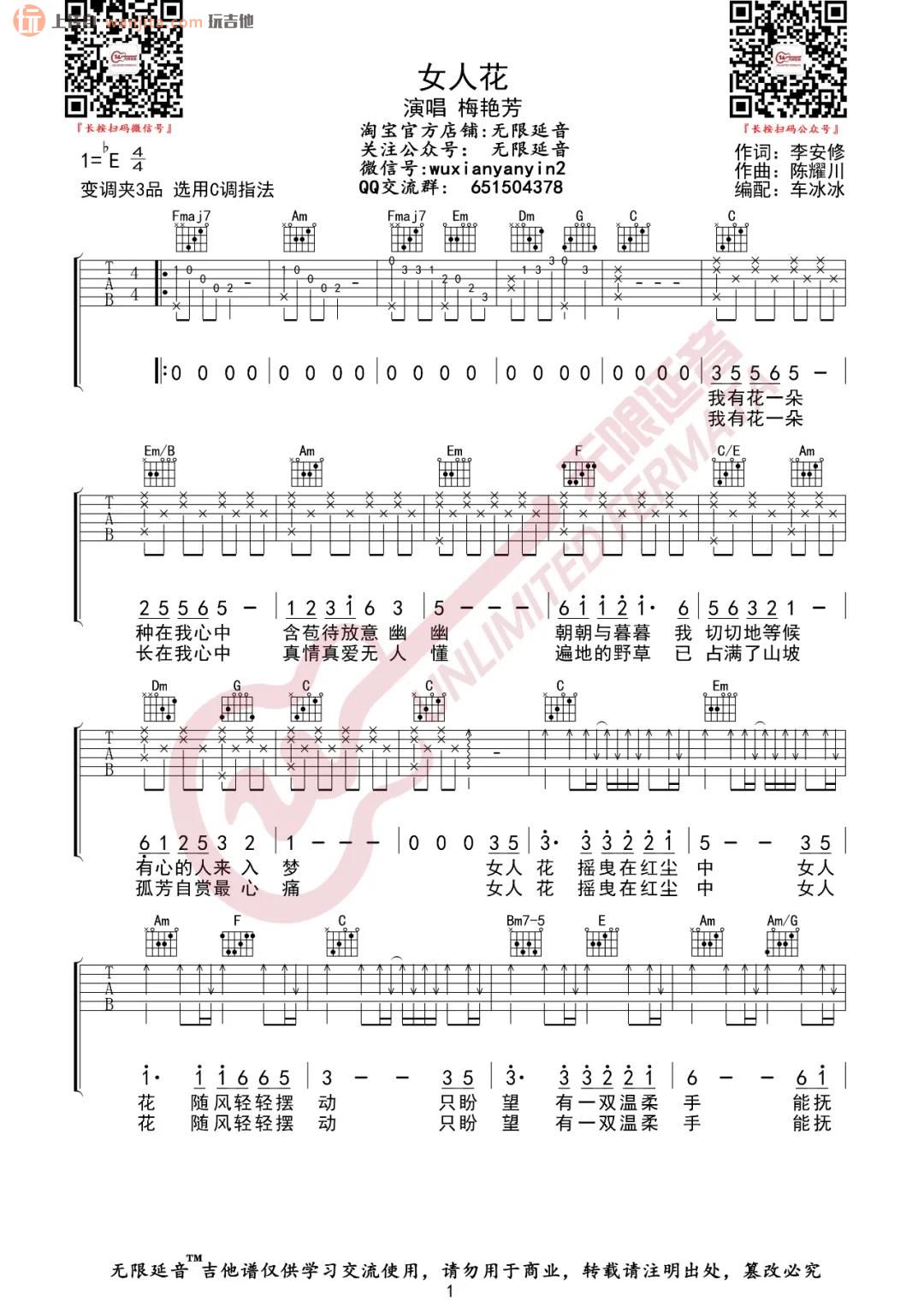 曲谱介绍: 《女人花》吉他谱,原调是bE调,选用C调指法,变调夹夹3品可以弹唱原调,这首版本包含了前奏部分,半分解和弦弹唱主歌,副歌以扫弦弹唱。