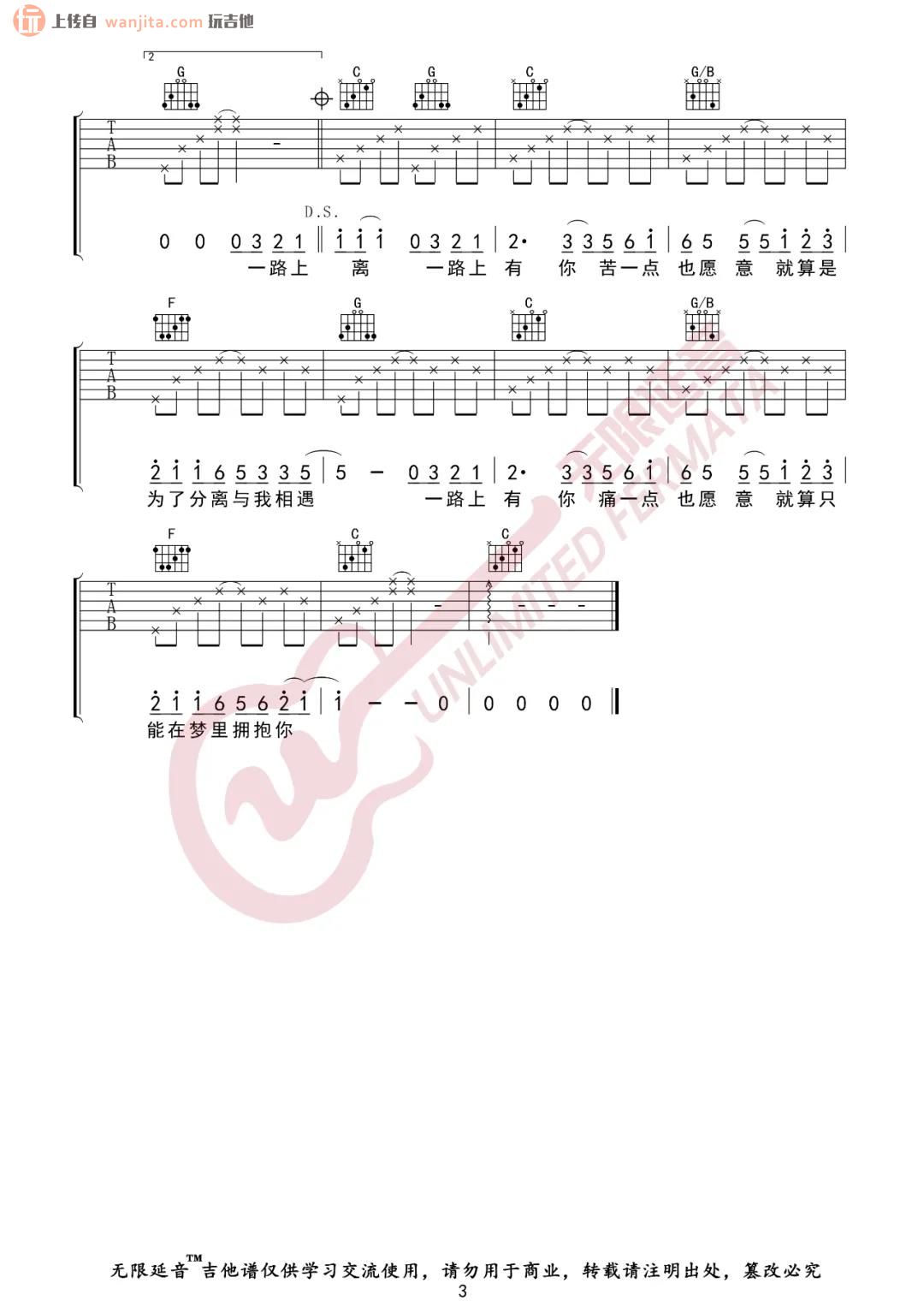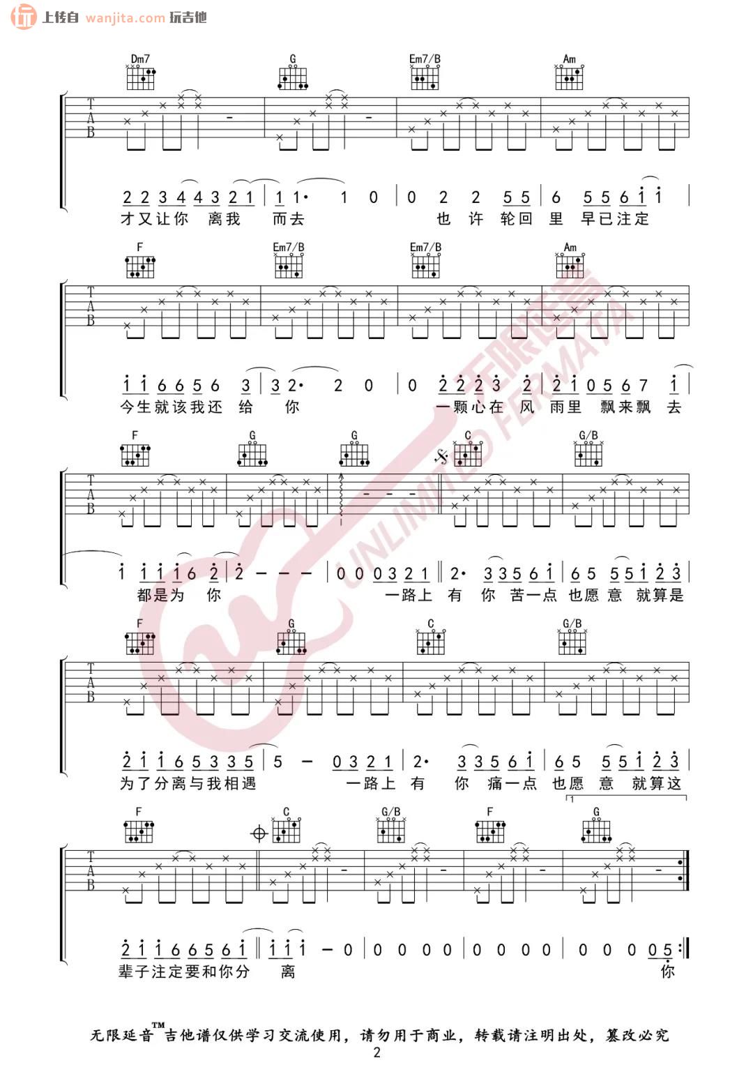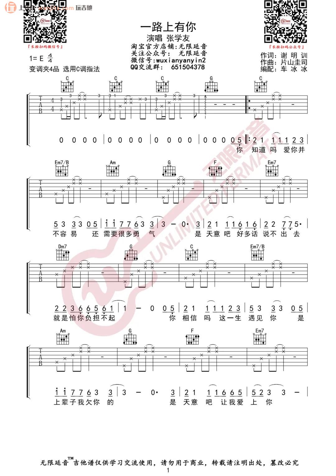 曲谱介绍: 《一路上有你》吉他谱,由无限延音制谱,原调是E调,选用C调指法编配,弹唱难度不大,包含了完整的前奏,主要以分解和弦温柔的弹唱即可。